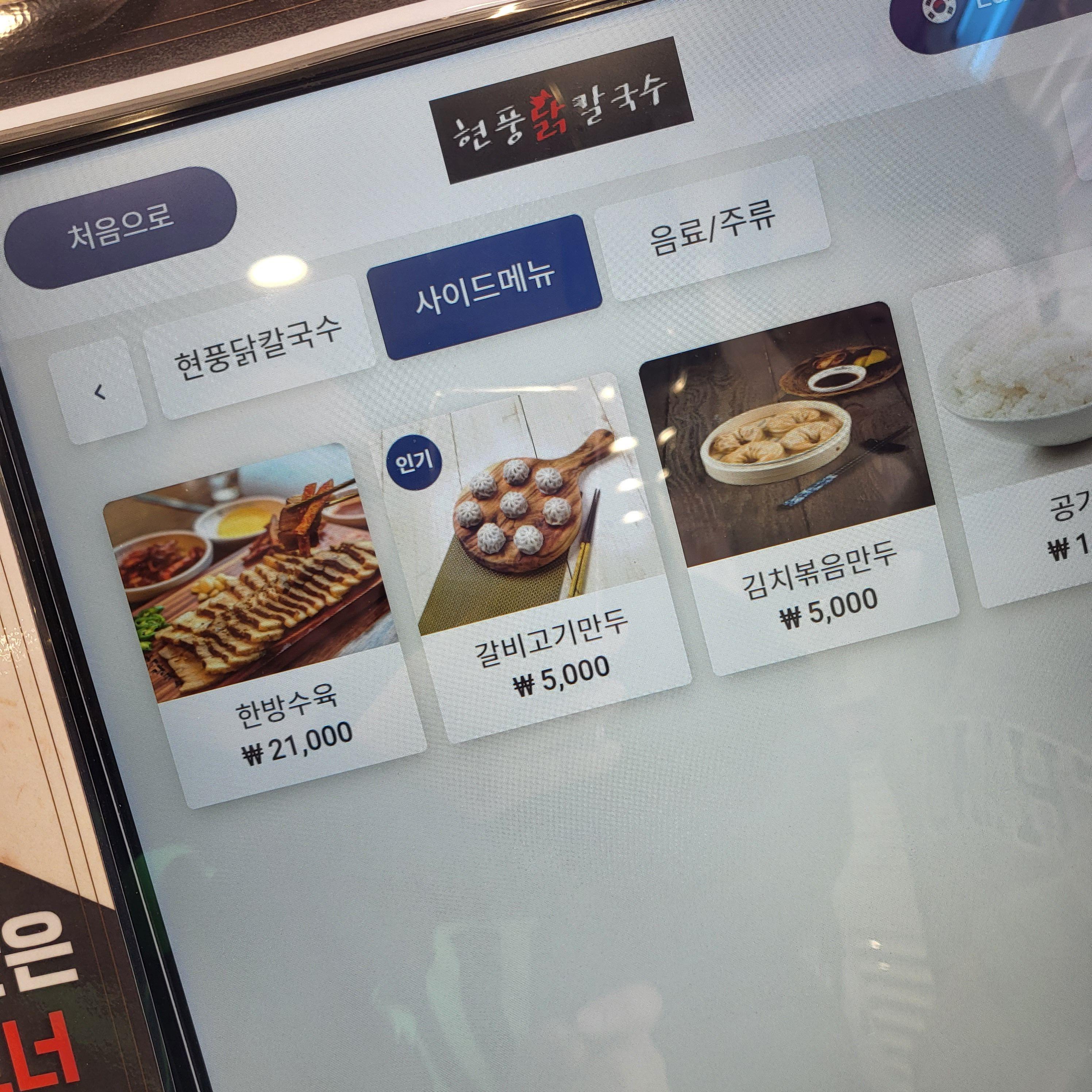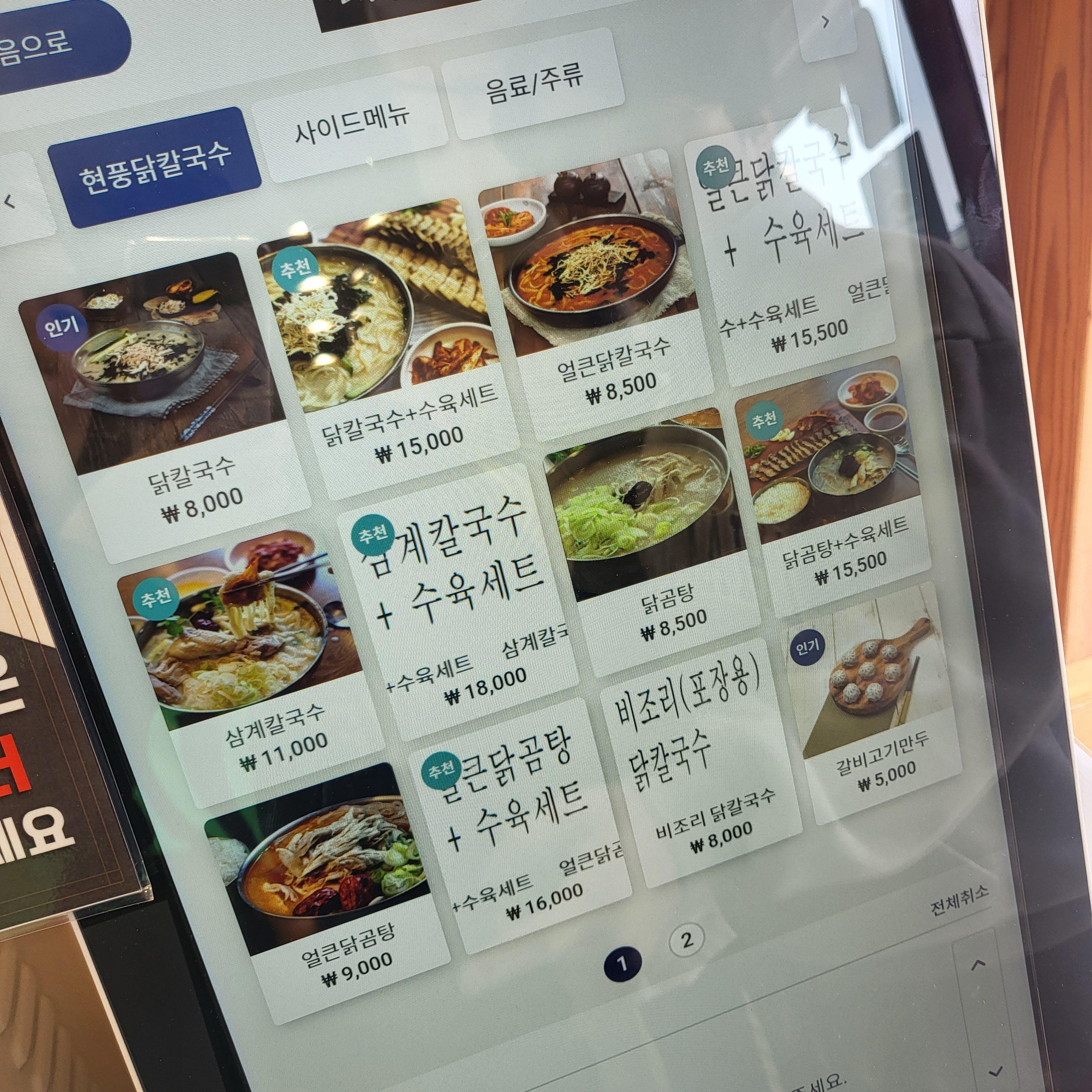메뉴는 크게 닭칼국수, 삼계칼국수, 닭곰탕이 있고 이 메뉴에서 살짝 맵게 드시려면 얼큰 닭칼국수, 얼큰 닭곰탕을 드시면 돼요. 사이드에는 수육과 만두가 있어요.