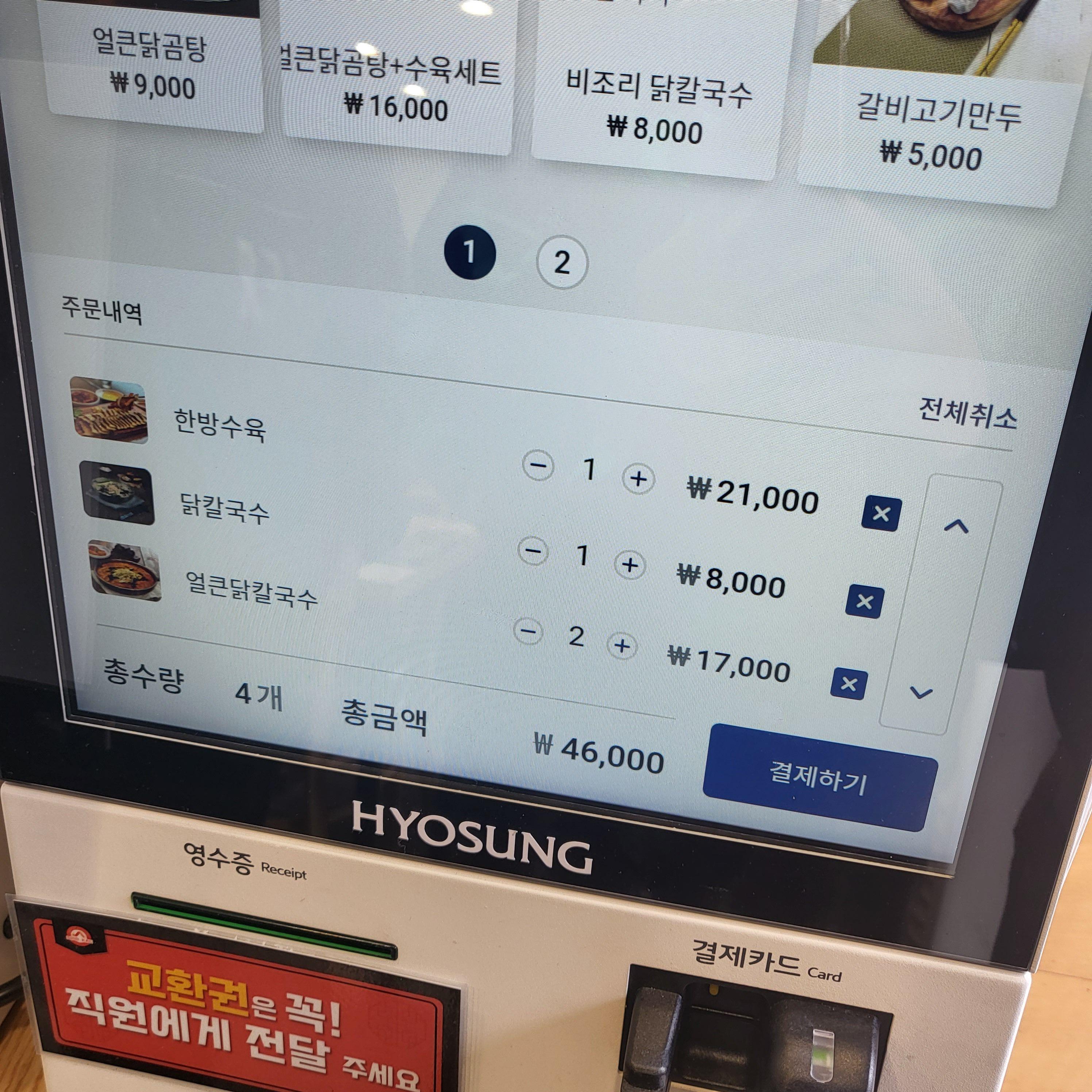 저희는 한방수육과 닭칼국수 하나, 얼큰 닭칼국수 두 개를 시켰어요. 그렇게 해서 총 46,000원이 나왔네요.
