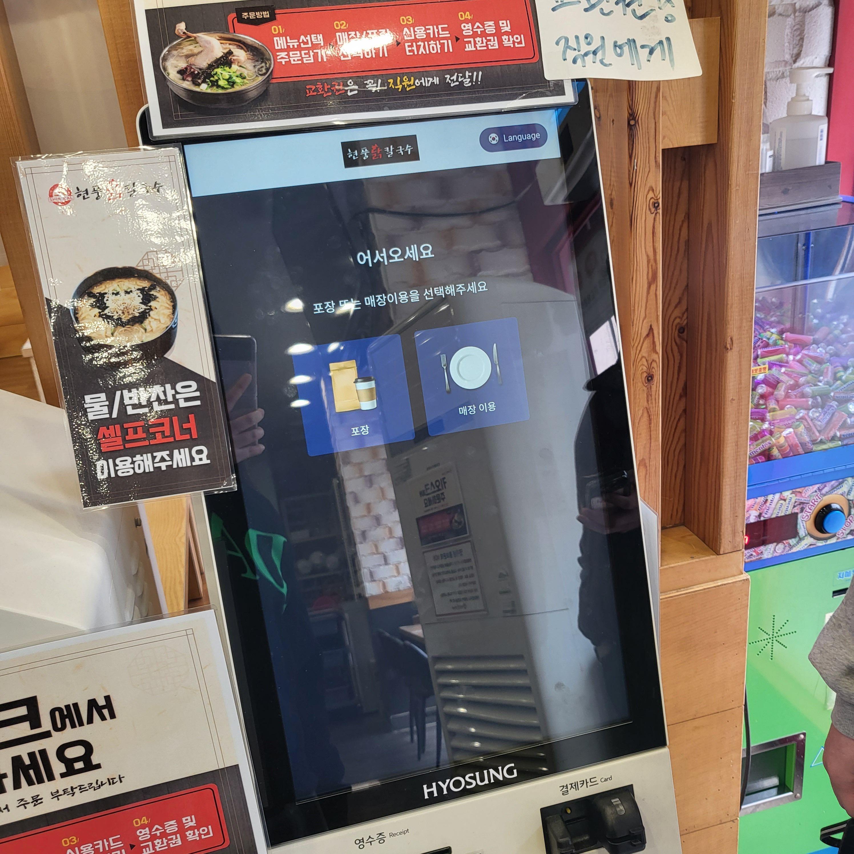 자리에도 메뉴판이 있지만, 주문은 입장하자마자 키오스크를 이용해서 할 수 있고, 포장도 가능해요. 키오스크 기기는 두 대 있었어요.