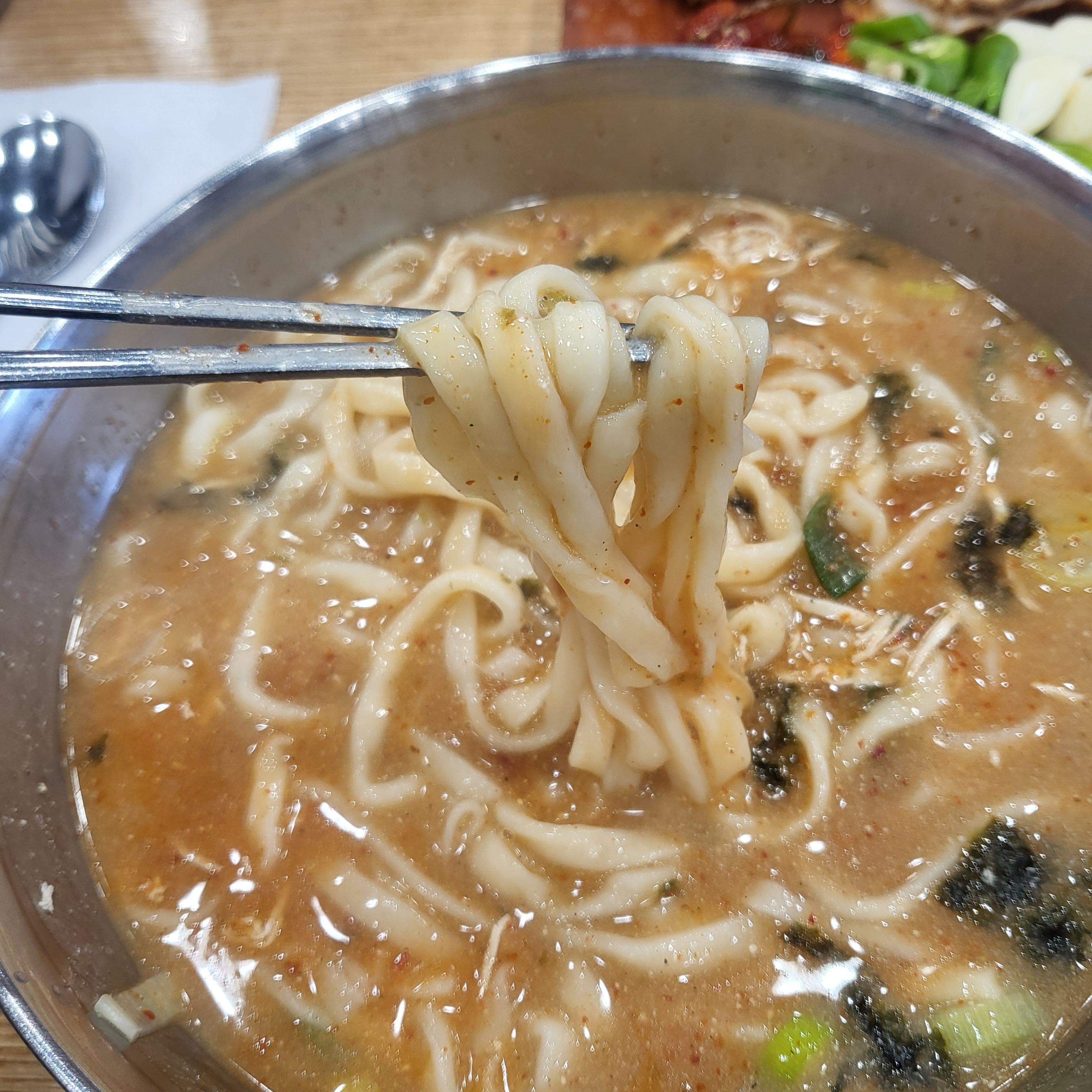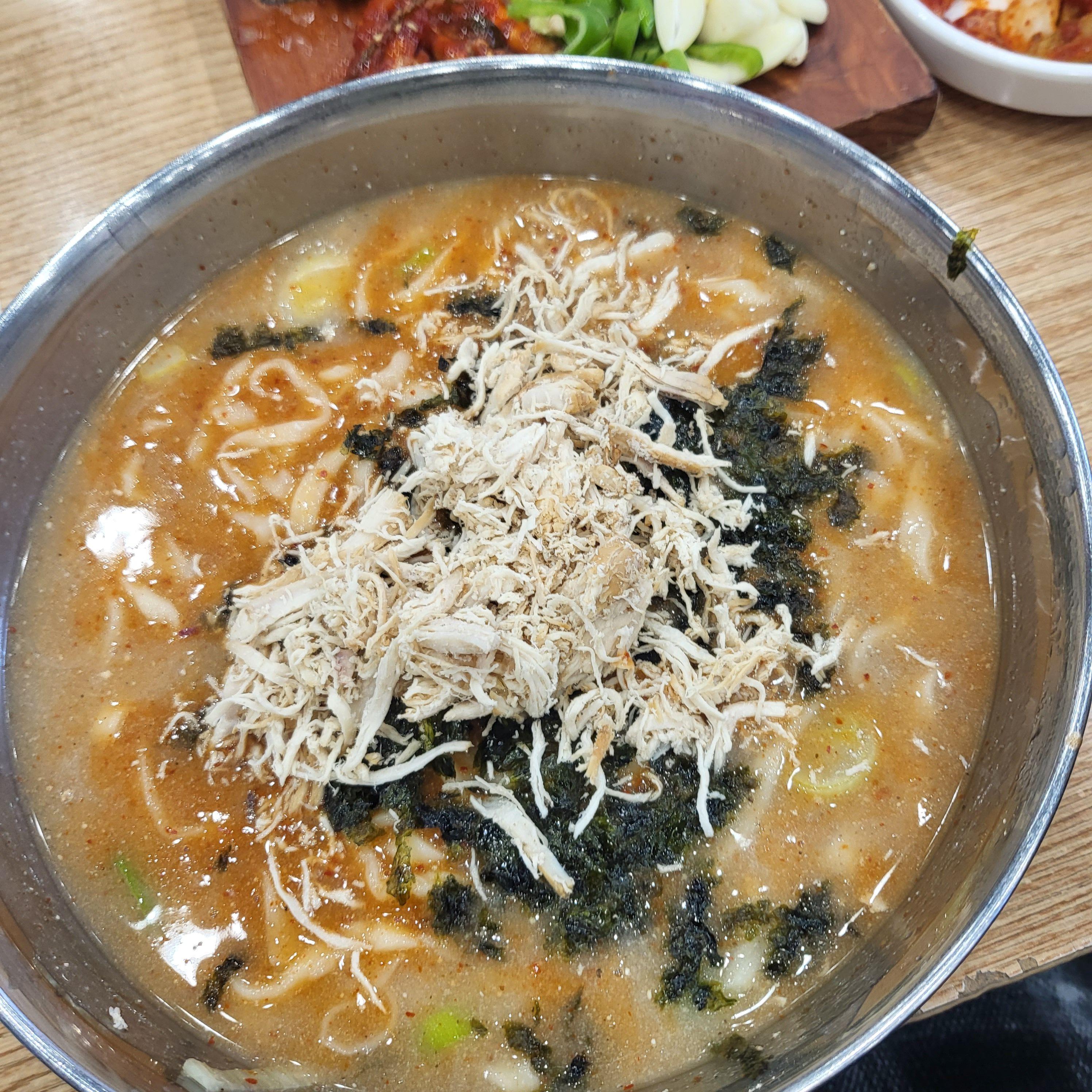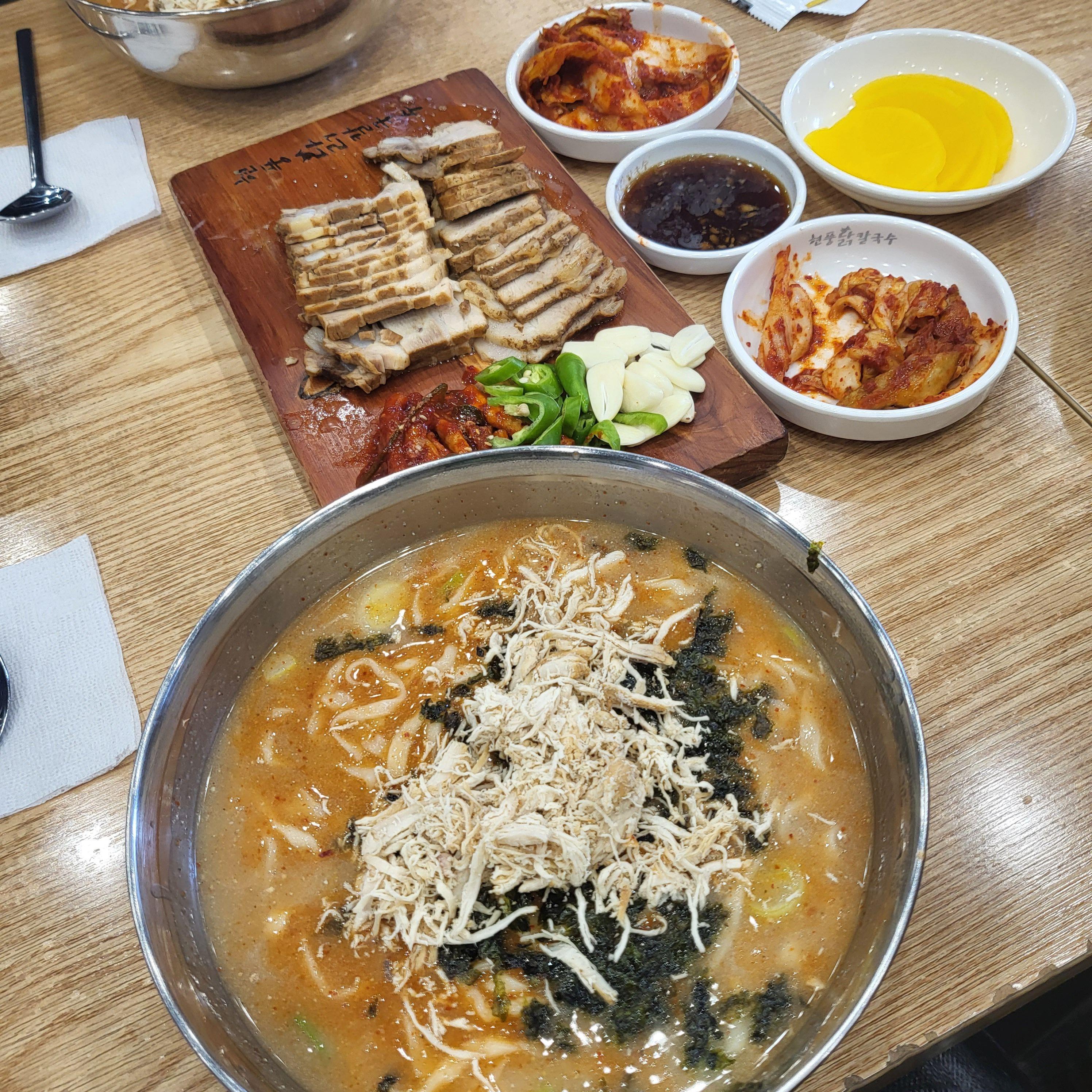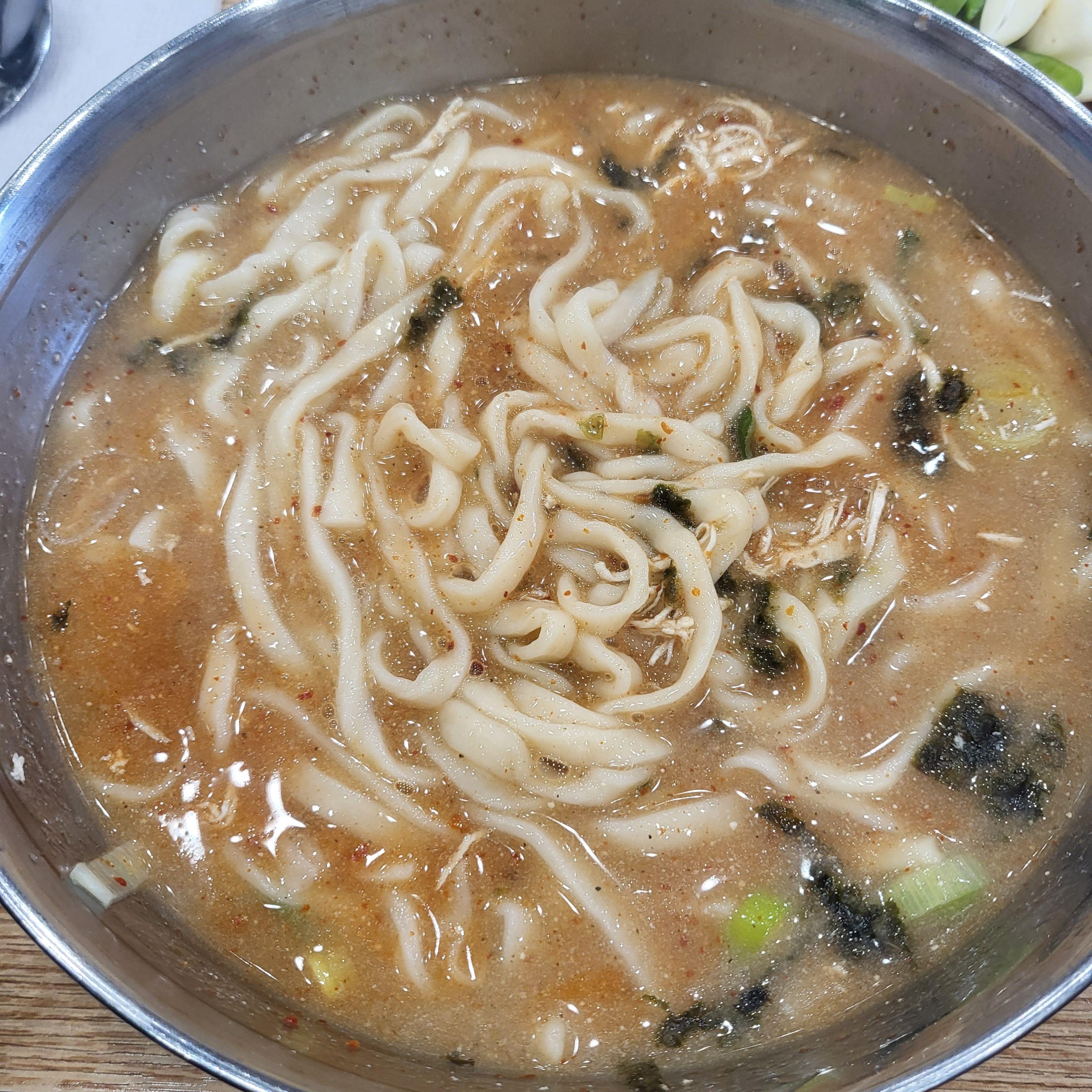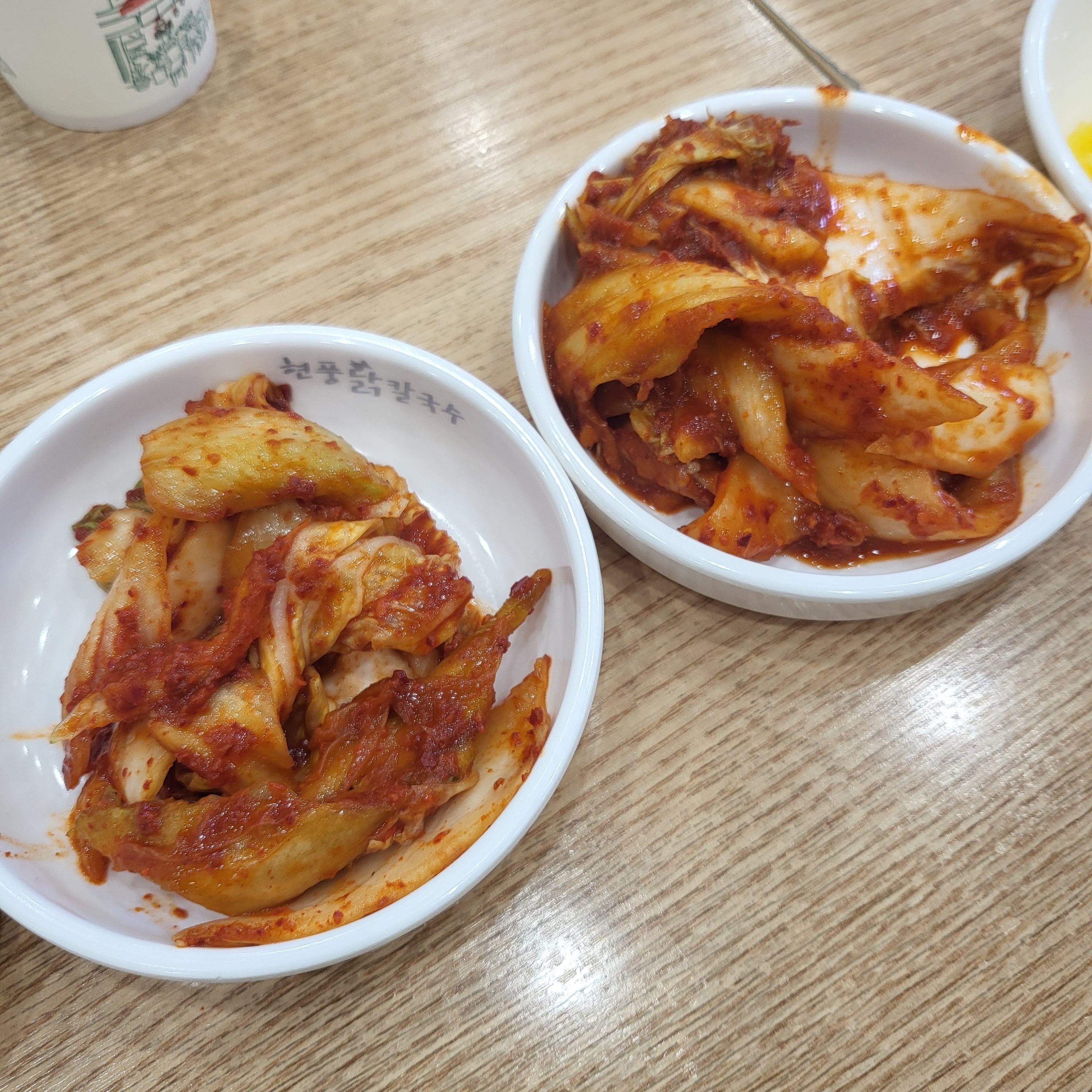 칼국수 면은 쫀득쫀득해요. 너무 잘 삶아졌었어요. 제 기억으로 다른 지점에서 먹은 얼큰 닭칼국수는 정말 매워서 눈물콧물 다 흘리고 먹었었는데 제가 맵찔이를 벗어난 건지(?) 본점에서 먹어보니 먹을만하더라고요. 얼큰 닭칼국수랑 매운 김치는 같이 먹기 힘들었는데 여기서는 같이 먹어도 크게 맵지 않았어요.