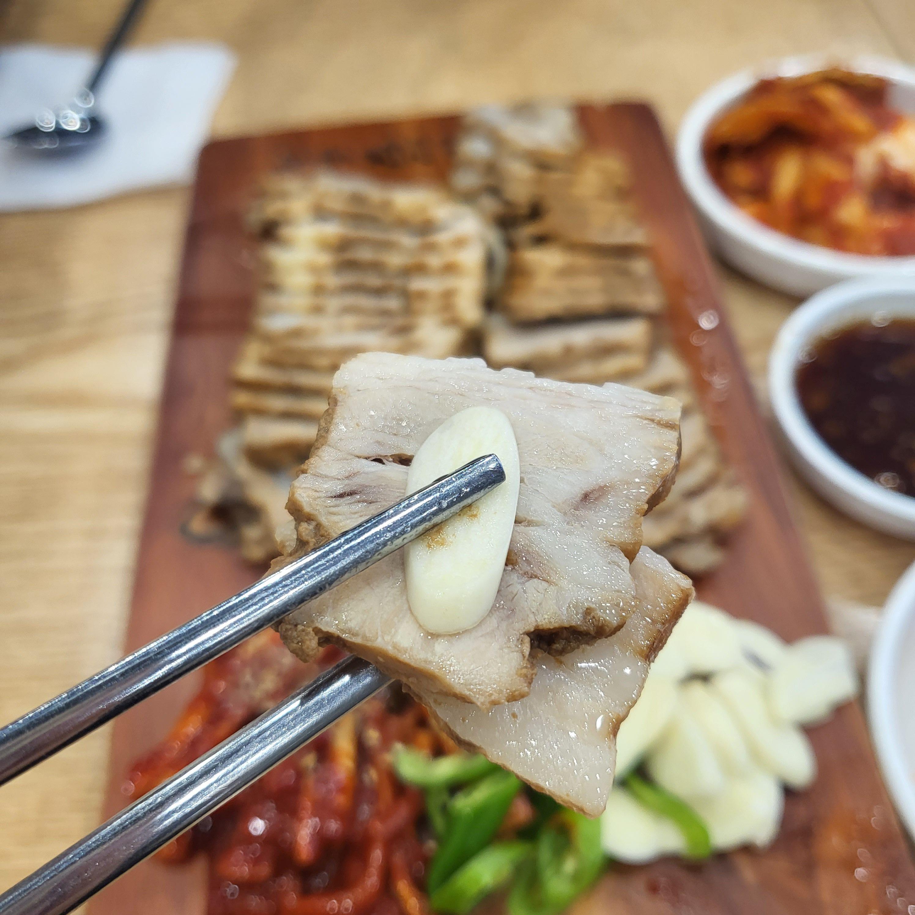 제가 좋아하는 생마늘~ 수육에 생마늘 올려서 냠냠! 잘게 썰은 고추와 무말랭이가 함께 나와요.