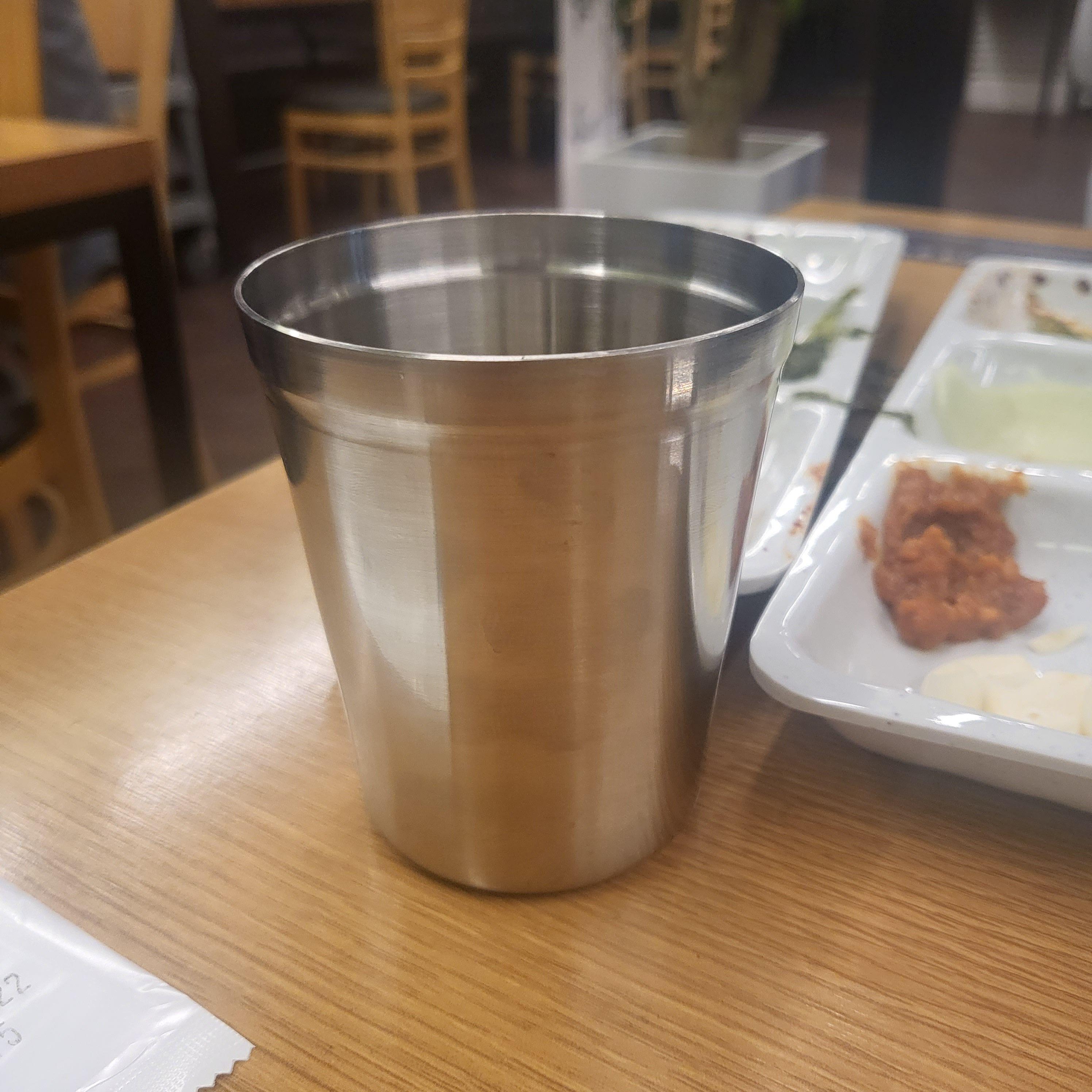그리고 여기는 물컵이 정말 커요. 진짜 마음에 들었던 부분이었어요. 다른 식당 가면 이런 스테인리스 컵 진짜 작은 거 아시죠? 근데 여기는 그 컵에 2.5배는 되어 보였어요. 물도 가득 담겨서 여러 번 왔다 갔다 안 해도 돼서 너무 좋았어요!!
