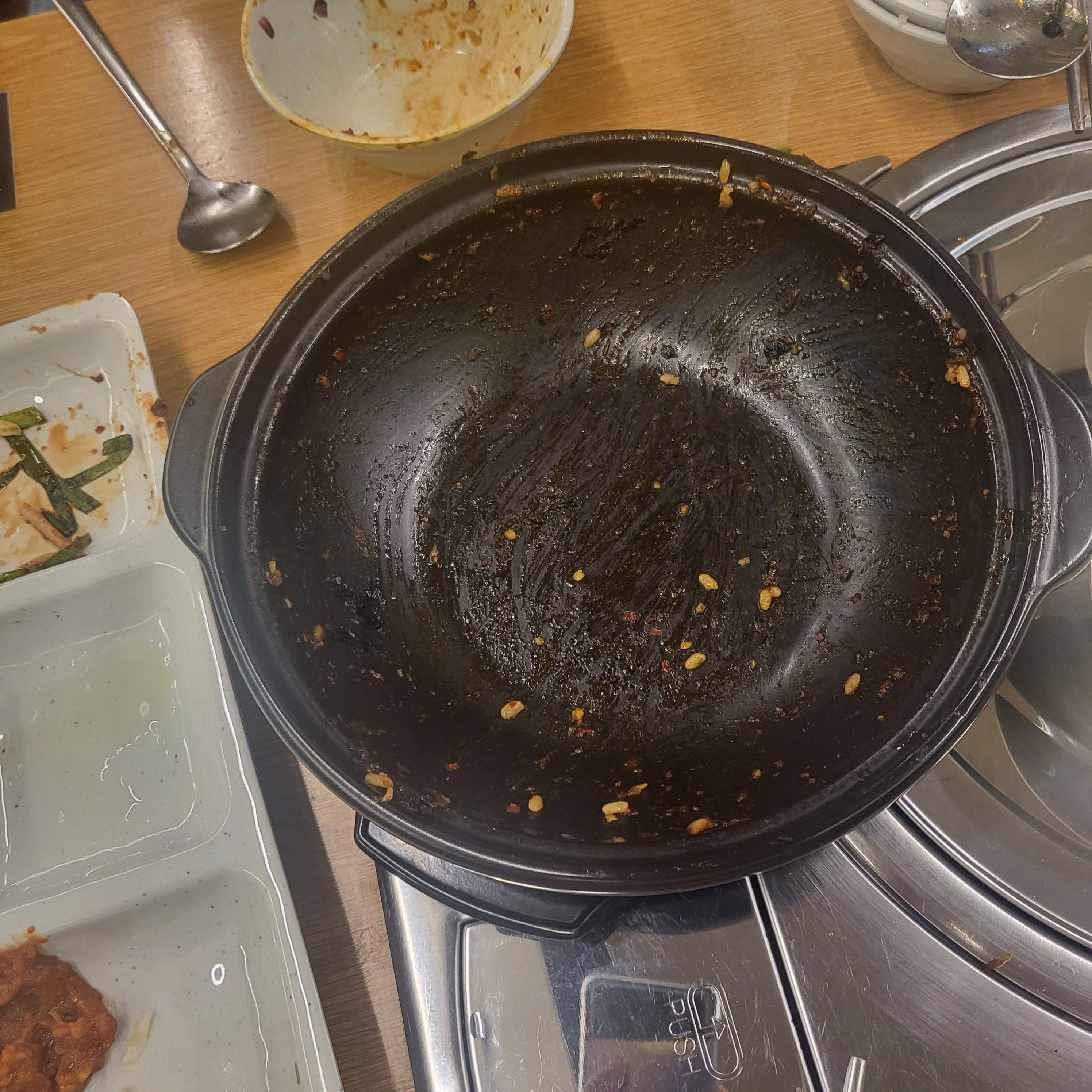 그리고 계란죽 같은 것도 나와요. 갈비찜이 나오기 전 먹을 만큼 밥과 반찬들을 떠 와서 테이블 세팅을 완료했어요.