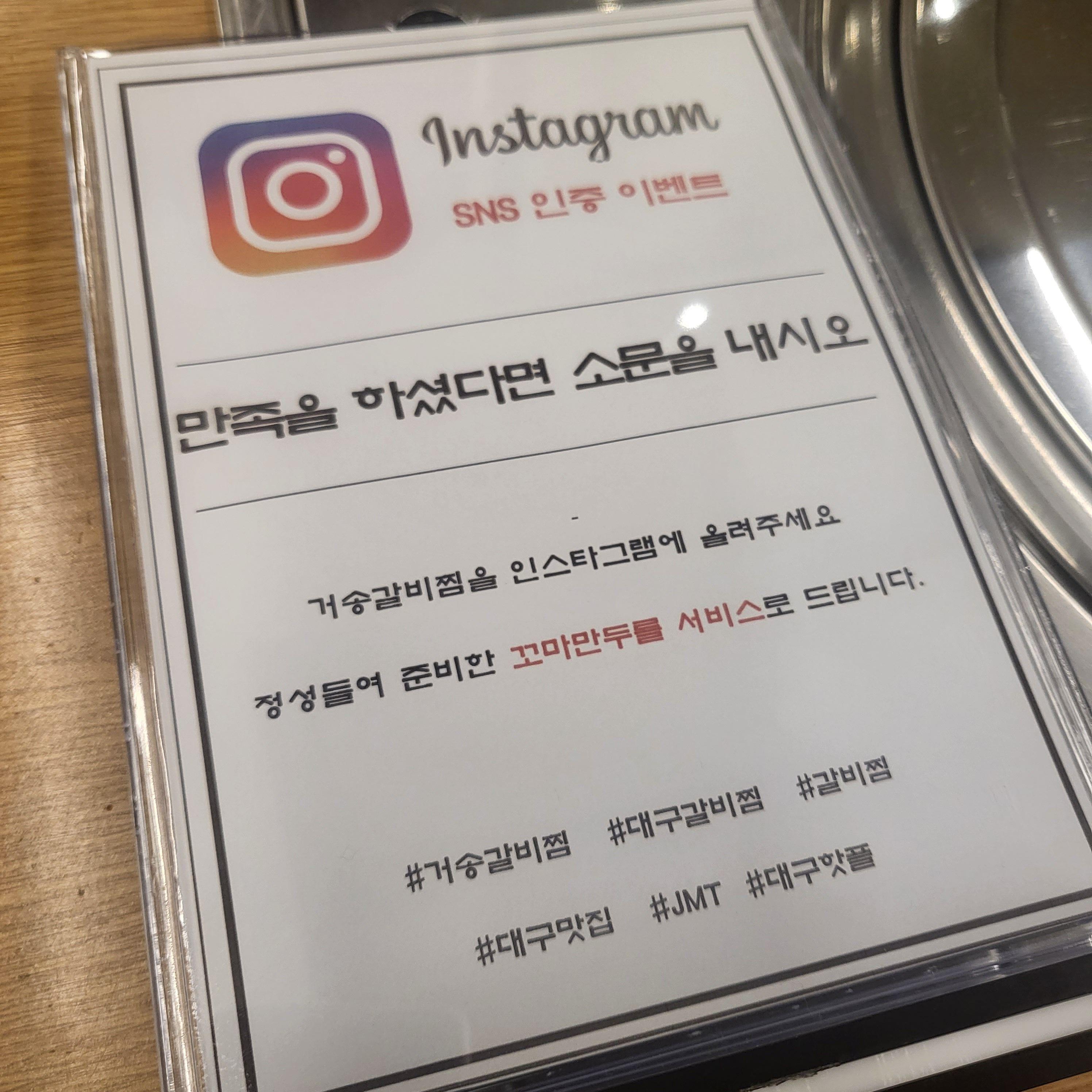 갈비찜집답게 메뉴는 소갈비와 돼지갈비가 있어요. 인스타그램에 게시글을 올리면 꼬마만두 서비스 이벤트도 하고 있더라고요. 저는 블로거인데~! 블로거는 안 되나요 ㅎㅅㅎ