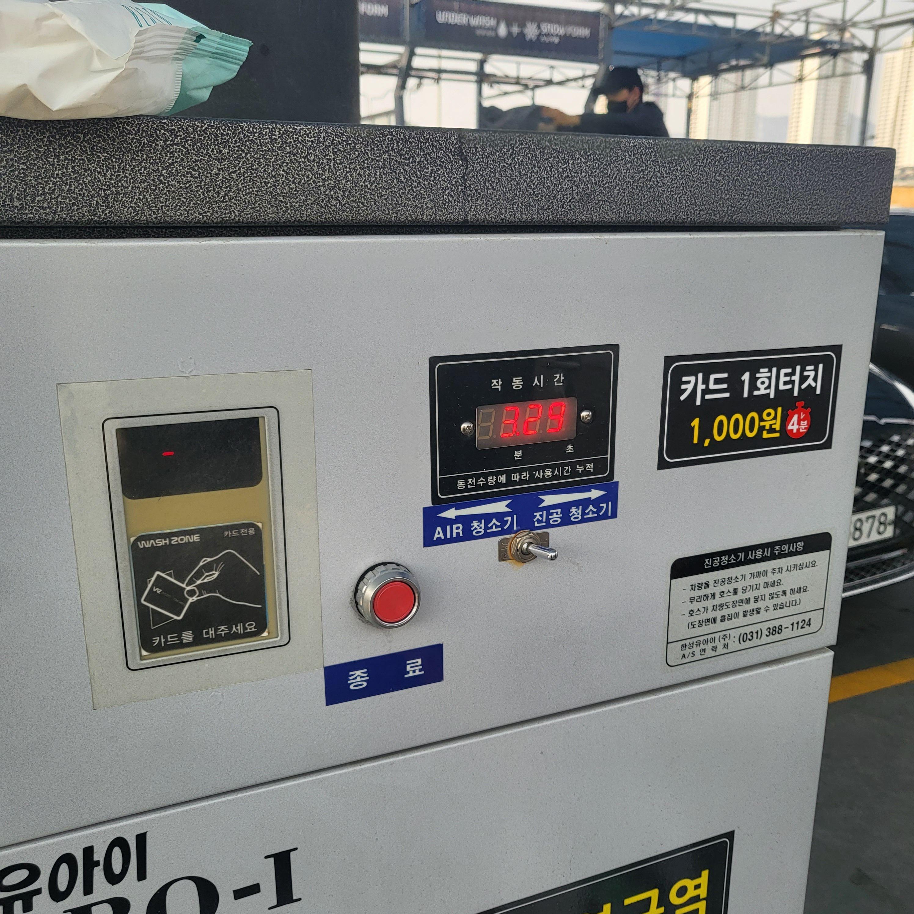 우선 차 내부부터 청소했어요. 진공청소기 1회 이용 금액은 천 원이에요. 충전한 카드를 해당 위치에 터치하며 된답니다.