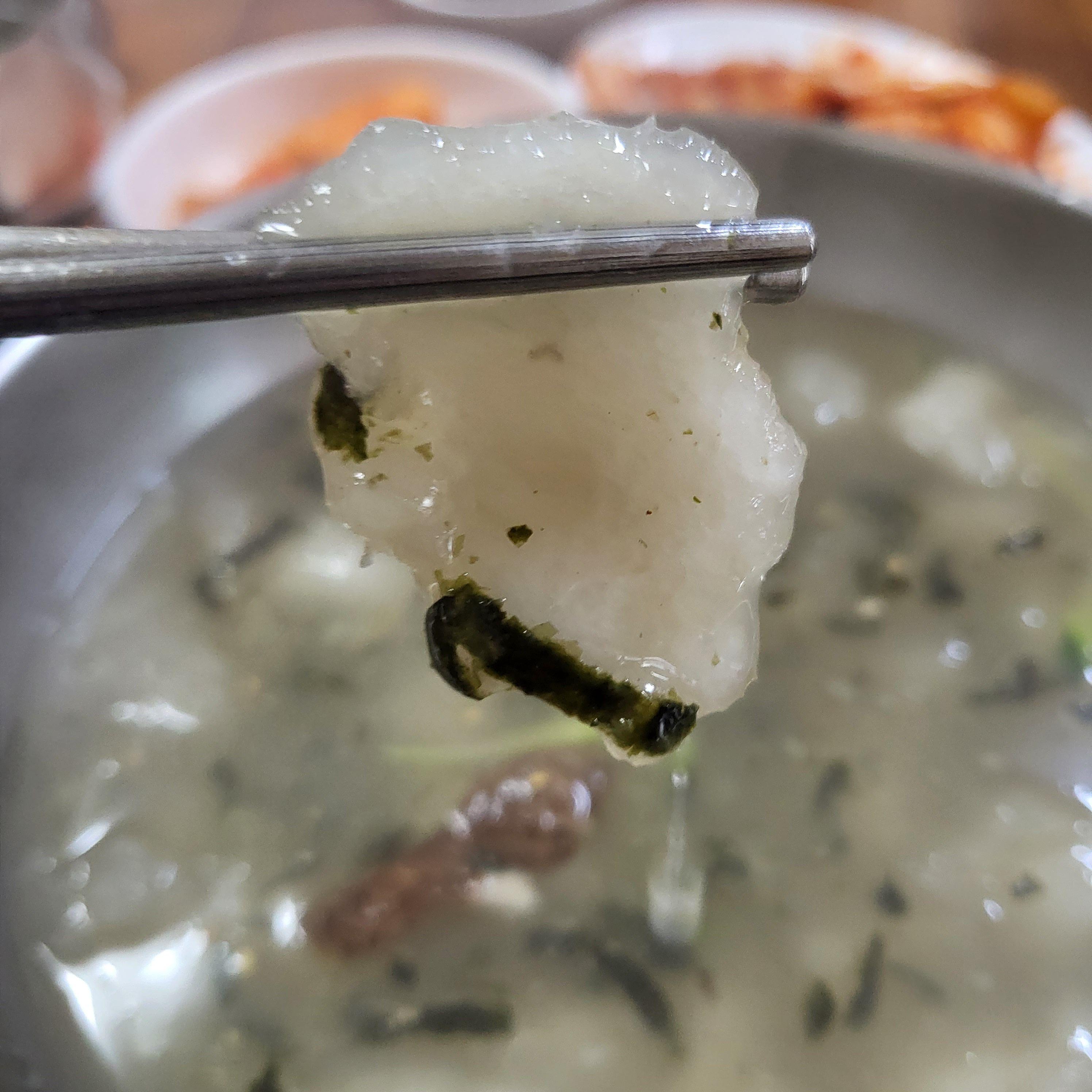 가까이에서 보면 이렇게 생겼어요. 투명한 겉 표면에 수제비 반죽같이 생겼어요. 근데 이 옹심이 자체에는 간이 안되어 있는지 아무런 맛이 없었어요. 그냥 되게 쫀득하더라고요. 쫀득한 식감만이 존재할 뿐...? 되게 심심한 맛이었어요. 그래서 깍두기나 김치랑 같이 먹어야 하나 봐요.
