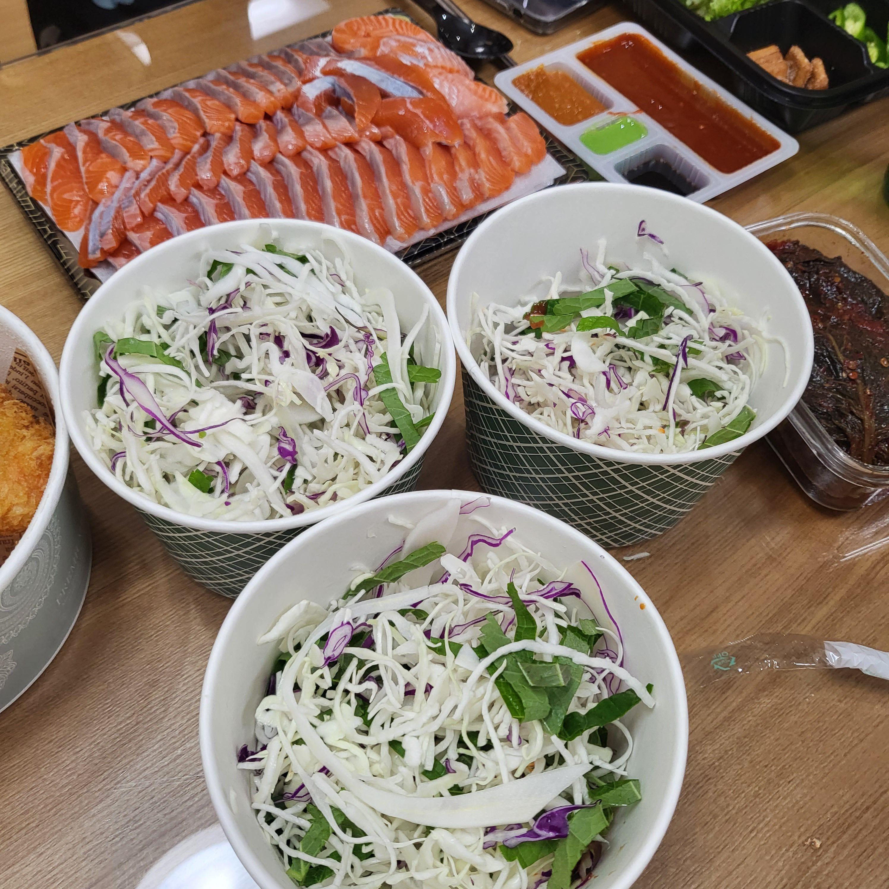 이렇게가 3인분 포장세트예요. 쌈야채랑 회장세트, 비빔야채와 비빔야채랑 비벼먹을 각종 소스들이 들어있어요.