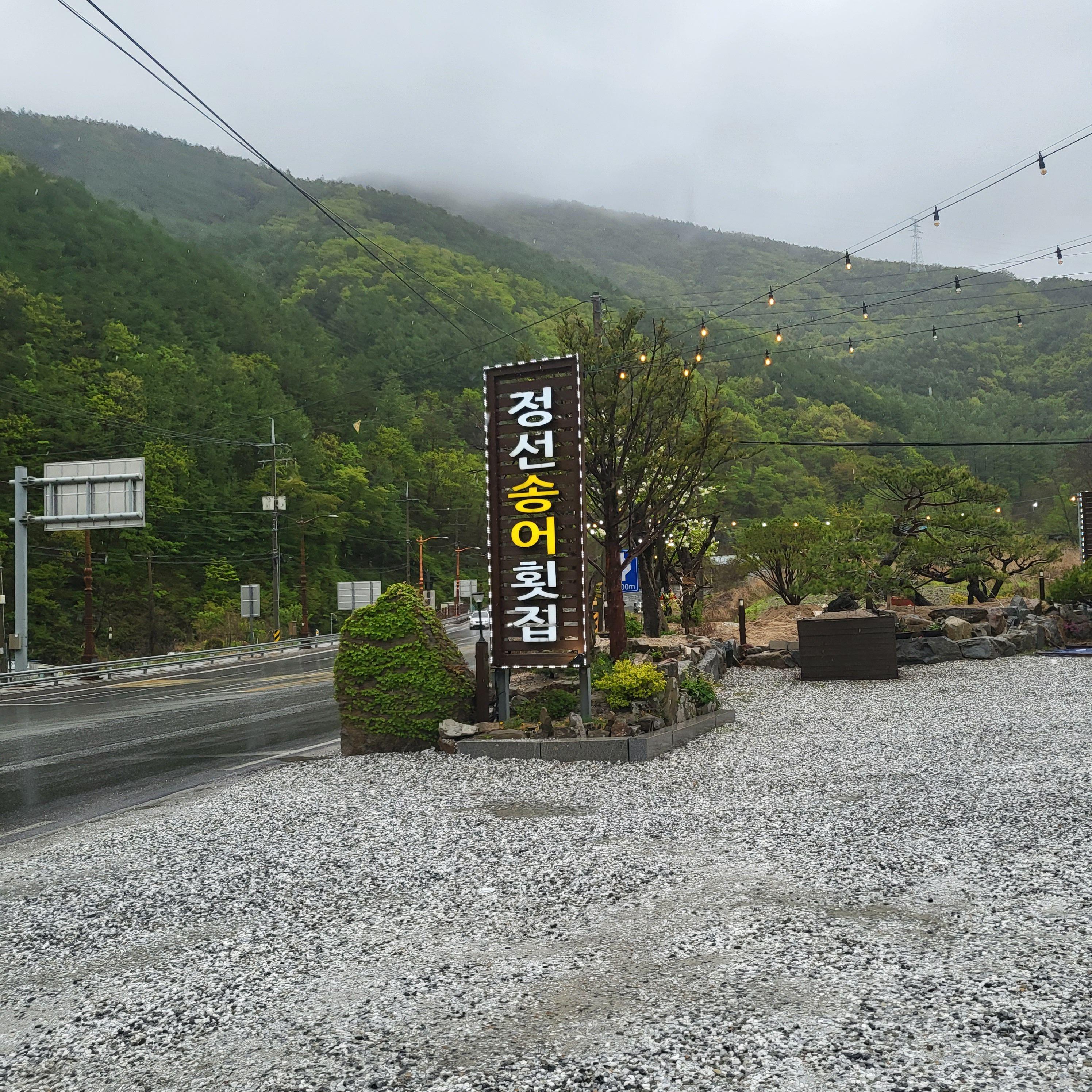 비가 와서 산에 안개가 가득 껴있네요. 뭔가 분위기 있어 보여요. 정선송어횟집의 주차장은 되게 넓었어요. 주차자리는 많으니 주차걱정 안 하셔도 돼요.