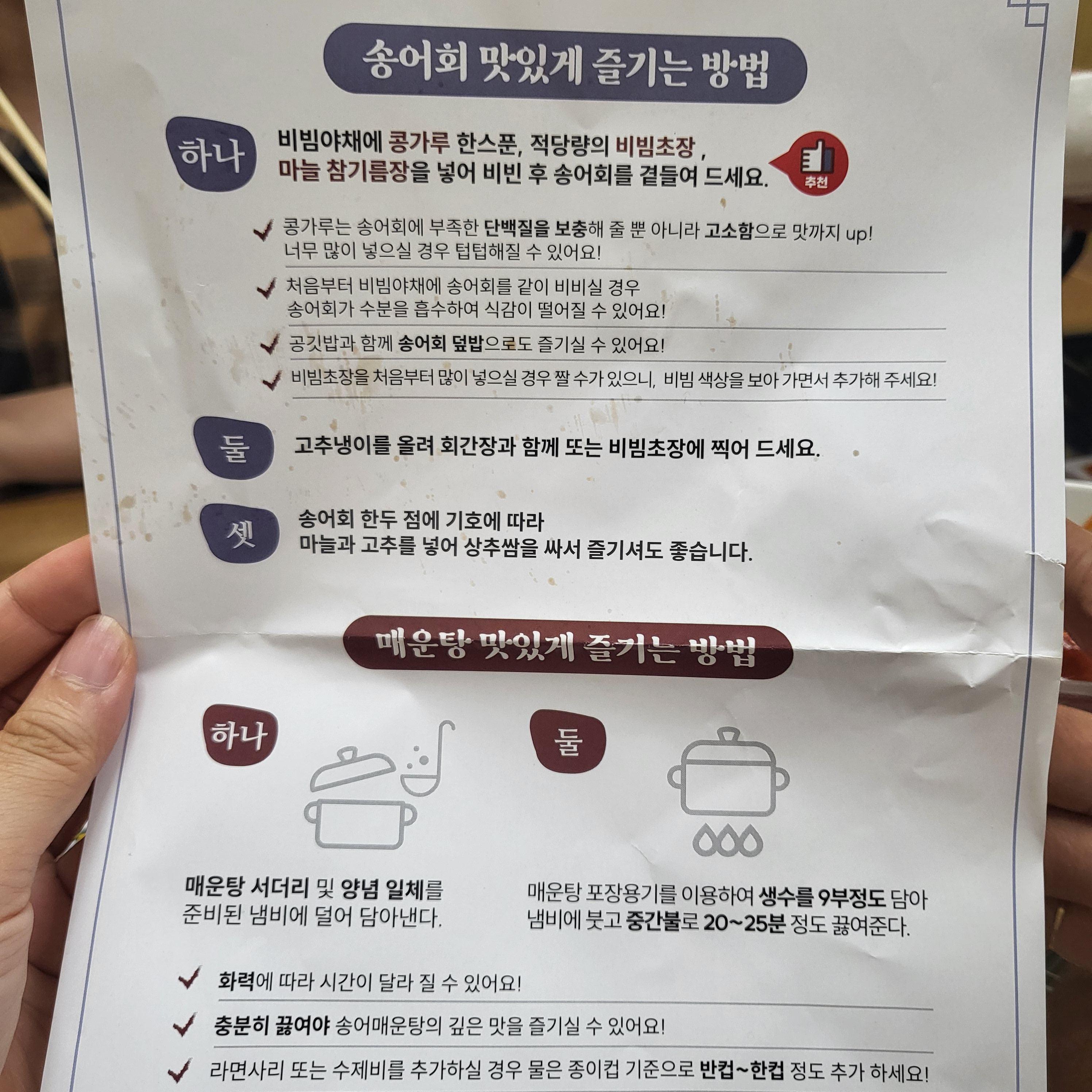 그리고 송어회를 맛있게 즐기는 방법이 적힌 종이도 같이 넣어주셨더라고요. 진짜 자세하게 꼼꼼하게 적어주시지 않았나요? 너무 감동...! 비빔야채에 콩가루, 초장, 마늘 참기름장을 넣어서 비벼서 같이 먹으면 더 맛있다고 하더라고요. 처음부터 송어회를 넣으면 식감이 떨어지는 등 상세하게 적혀있어서 송어회를 처음 먹는 저에게는 너무 좋았어요. 그리고 매운탕 끓이는 방법까지.. 너무 감동 백만 배였어요.