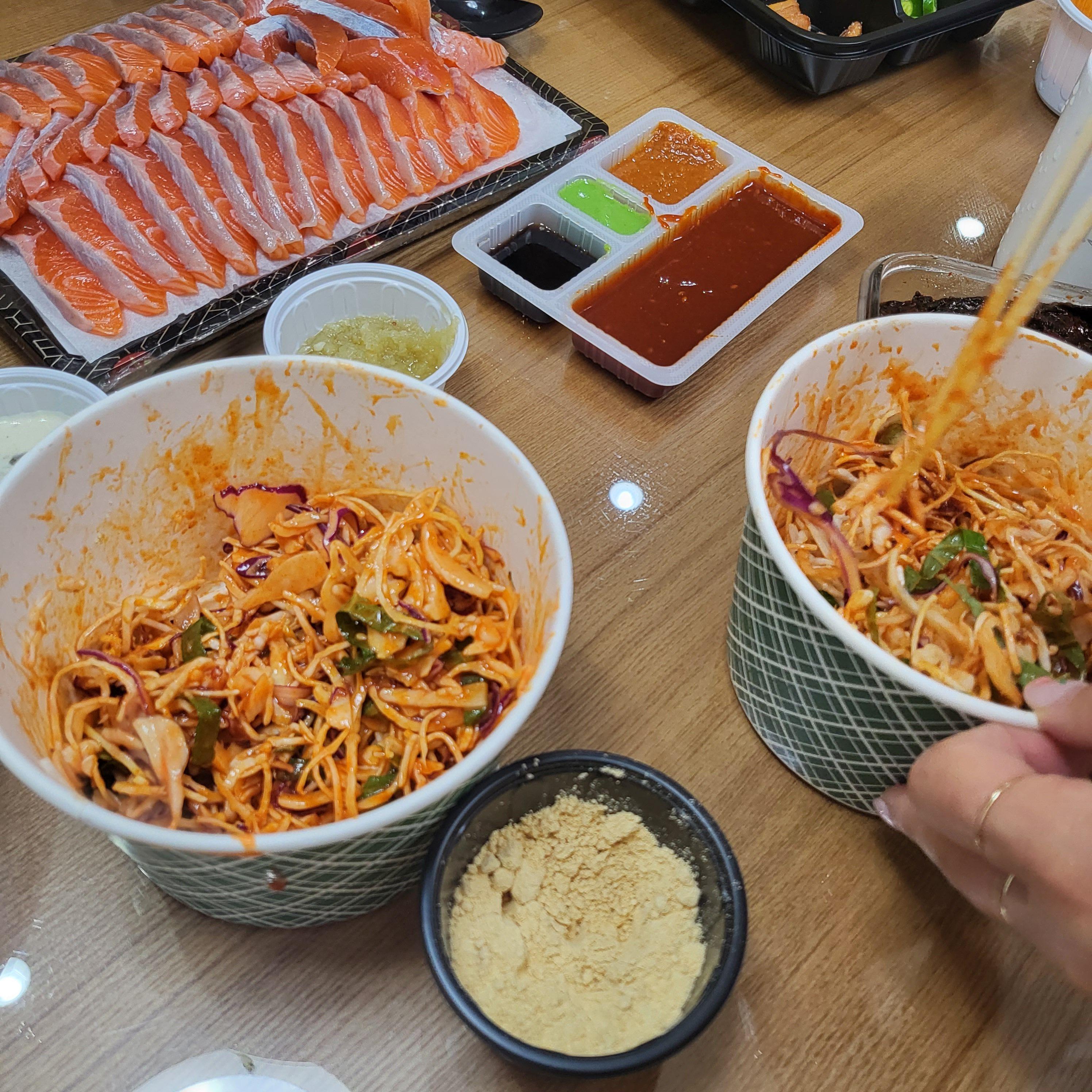 비빔야채는 3인분을 주문해서 3통이 왔는데 5명이서 먹기에 양이 충분했어요. 적힌 설명법대로 콩가루 넣어 잘 비벼서 송어회랑 같이 먹었답니다.