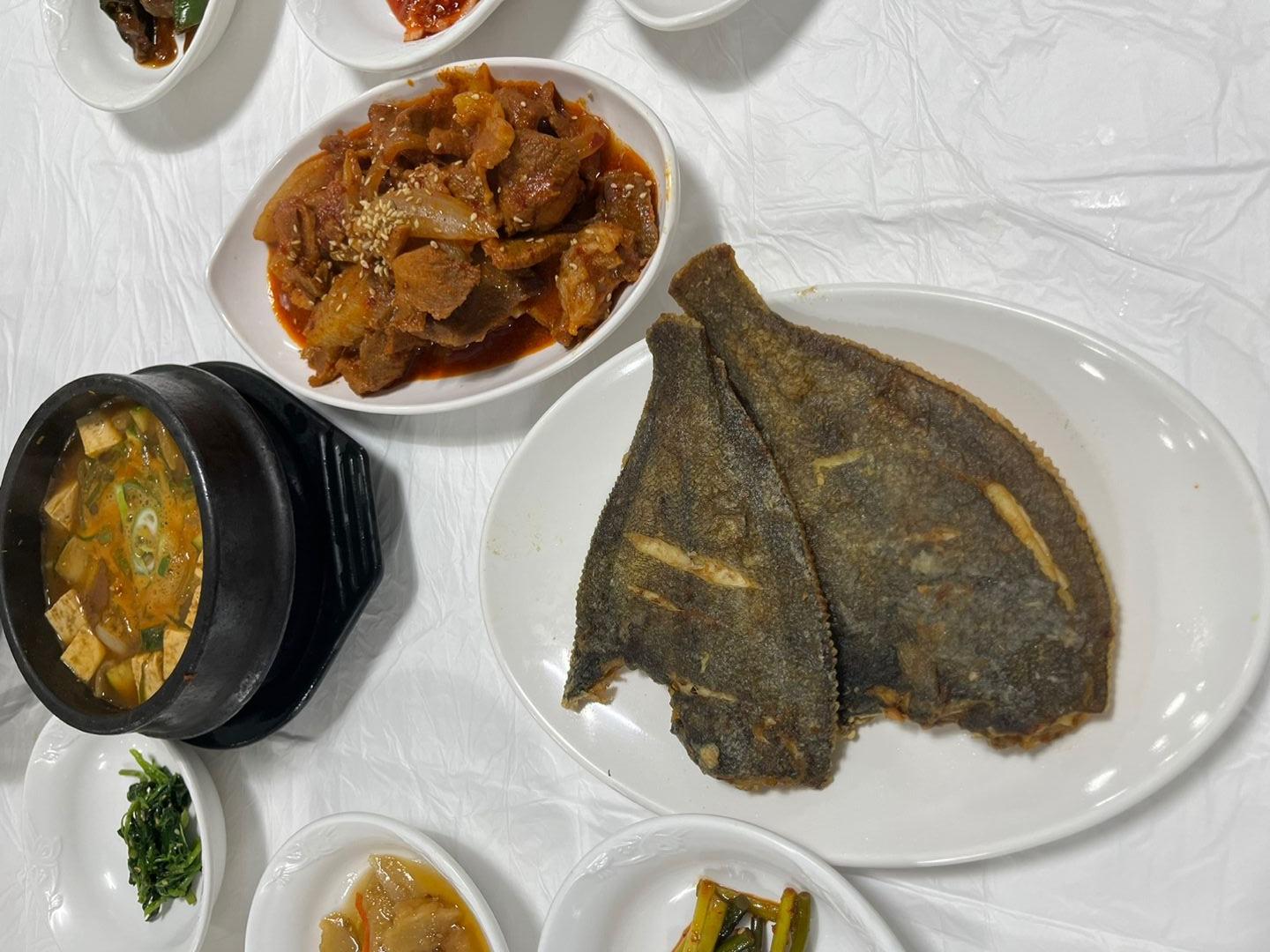 엄니정식 2인을 시키면 된장찌개와 가자미구이, 제육볶음이 나와요. 2명에서 먹기에는 아주 충분한 양인 것 같아요. 특히나 아침식사에는요. 간단하게 먹기보다는 든든하게 먹을 수 있는 한 끼!
