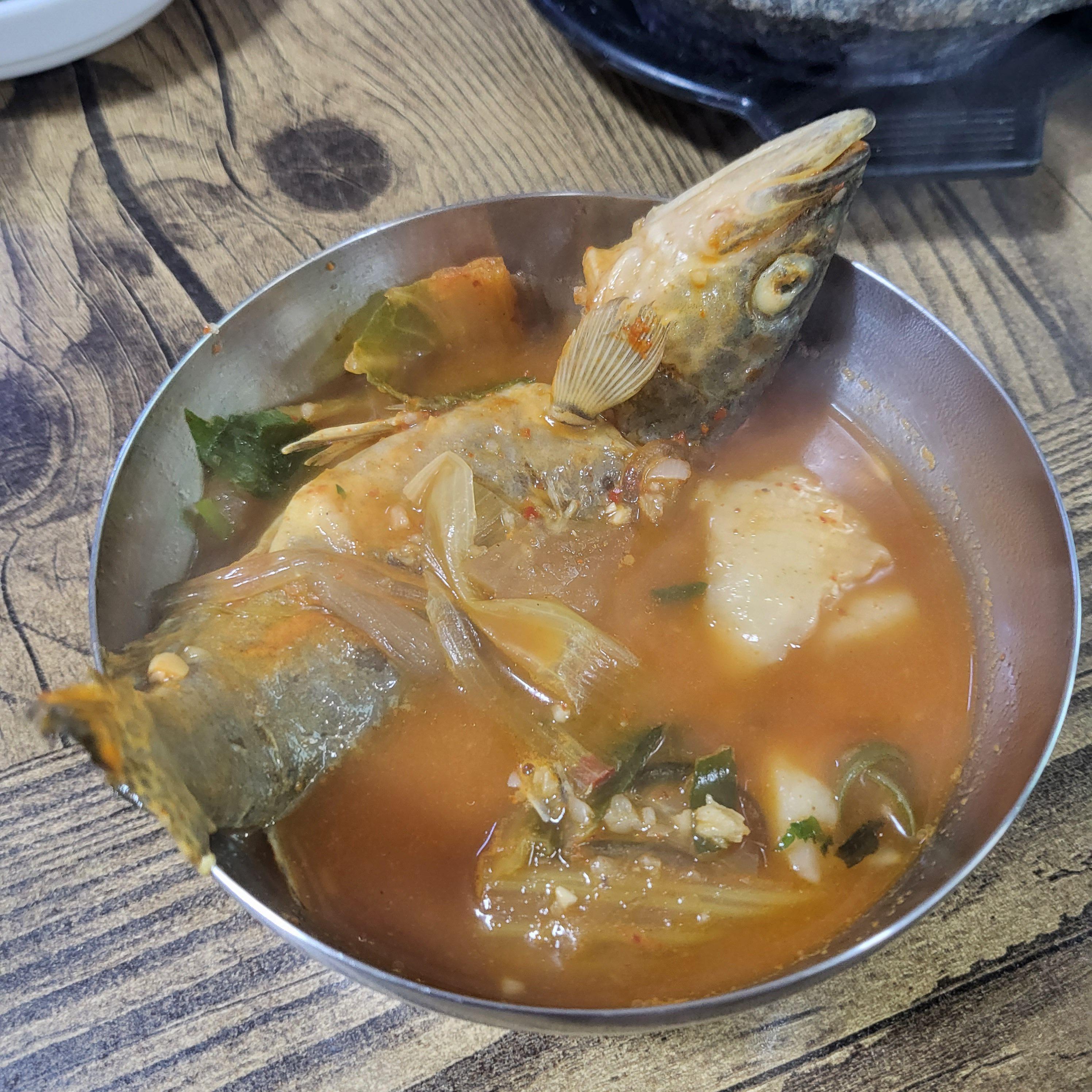 쏘가리 매운탕에는 진짜 쏘가리가 통째로 몇 마리씩 들어있었어요. 생선구이도 물고기 통째로 있는데 이 매운탕에 통째로 들어가 있는 물고기는...!! 생선구이와는 조금 다른 느낌이더라고요? 뭔가 미끄덩한 생선이...ㅎㅎ 거북하신 분은 못 드실 수도 있겠다 생각됐어요!! 참고로 저는 0.25초 정도 놀랬지만 잘 먹었답니다 ㅎㅎ