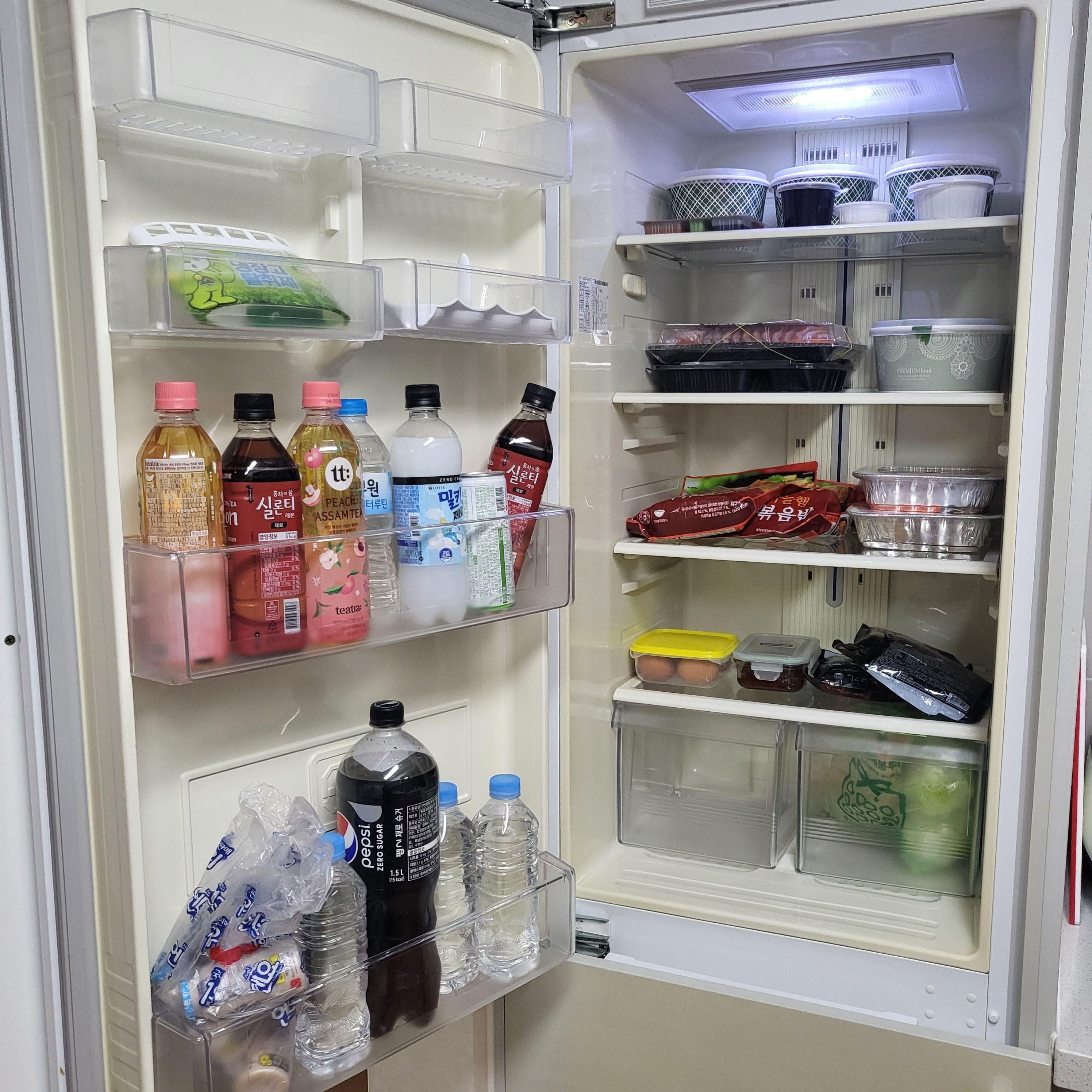 체크인해서 짐을 풀어주었어요. 장 봐온 거 냉장고에 가득가득 담기! 오는 길에 송어회도 사 왔어요.