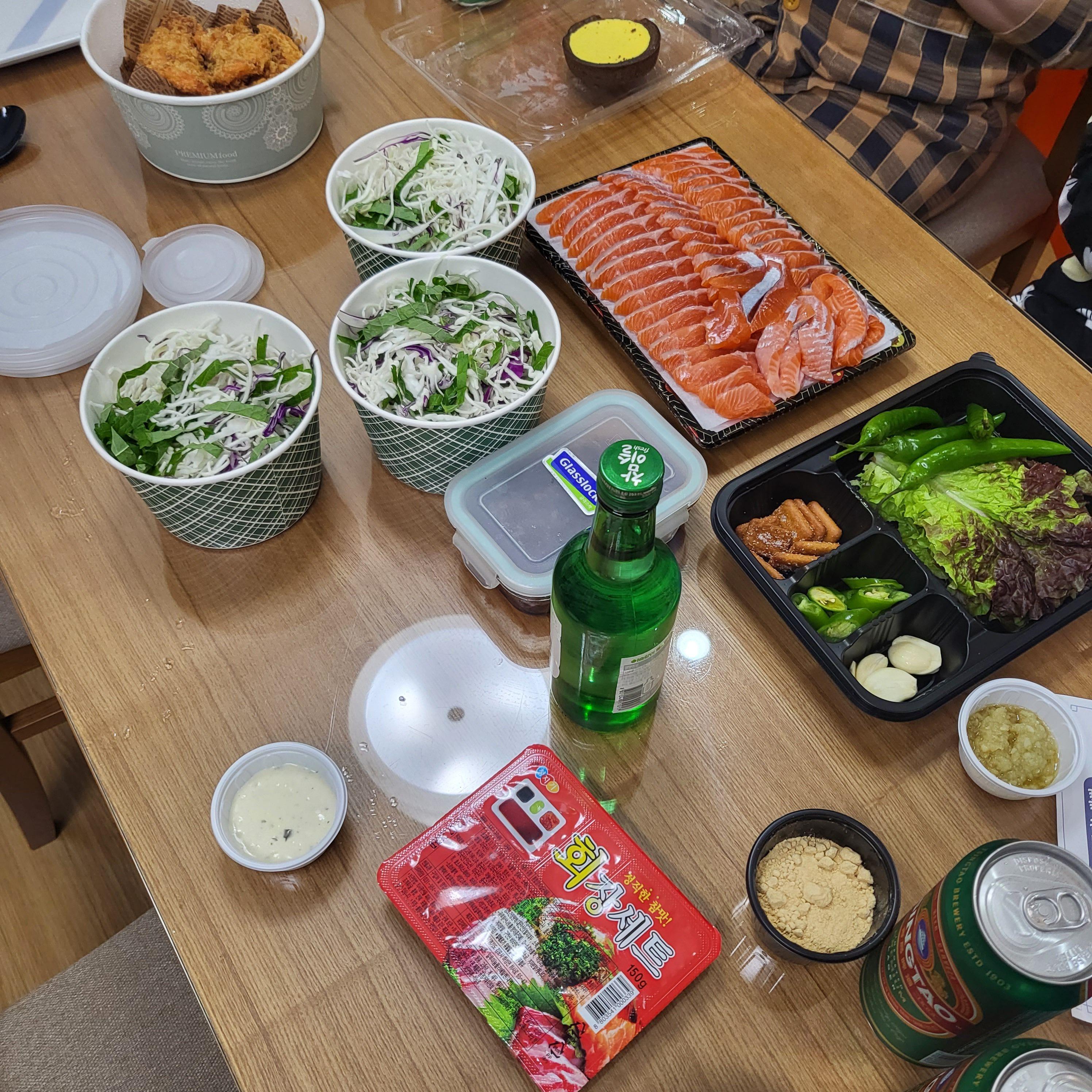 그리고 아까 사 온 송어회랑 송어튀김, 라면까지 끓여 먹어 줬어요. 살짝 늦은 저녁이지만 배 빠방하게 먹었네요.