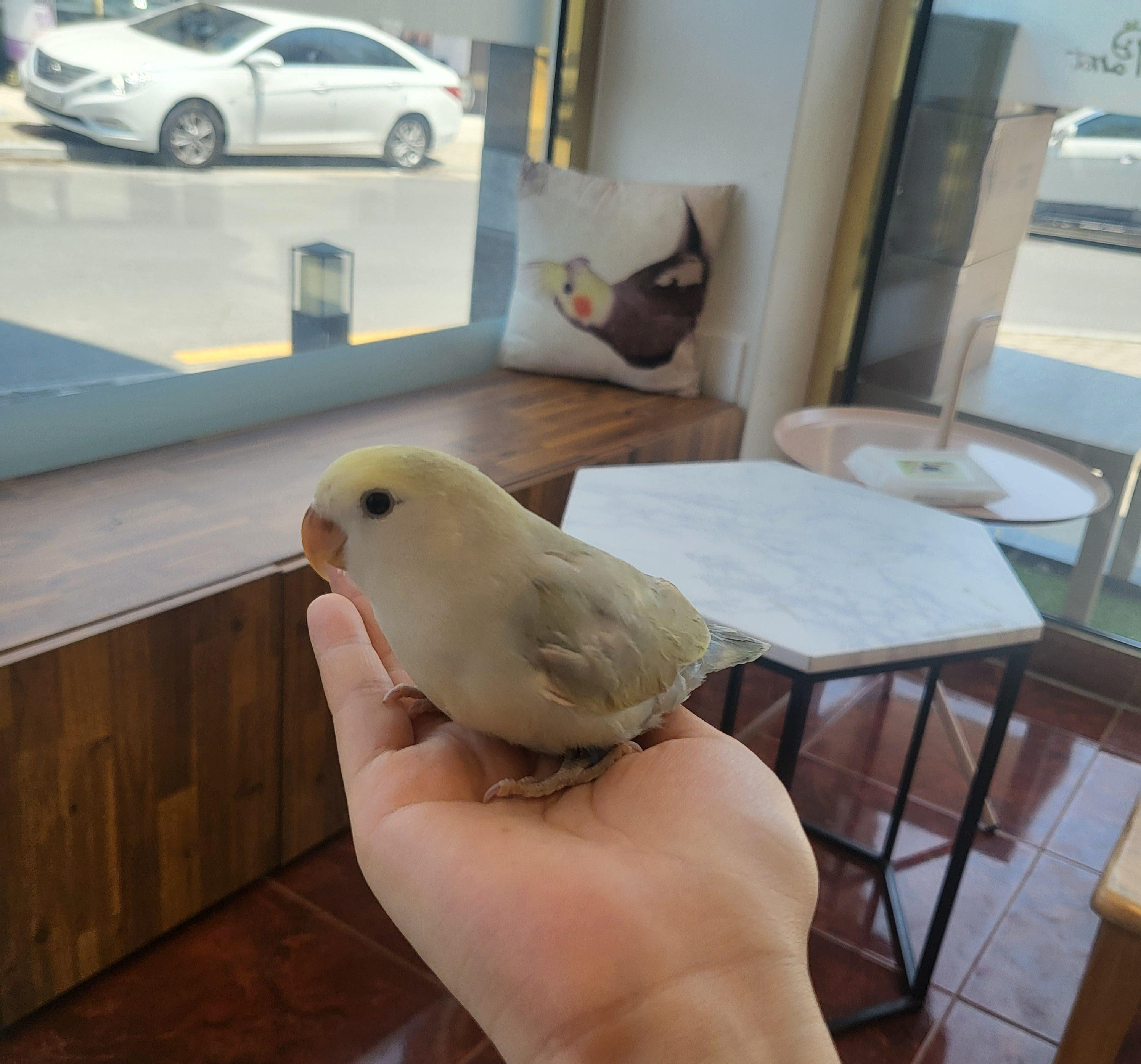이 앵무새는 아직 아가라서 이렇게 손바닥에 올려두라고 하셨어요.