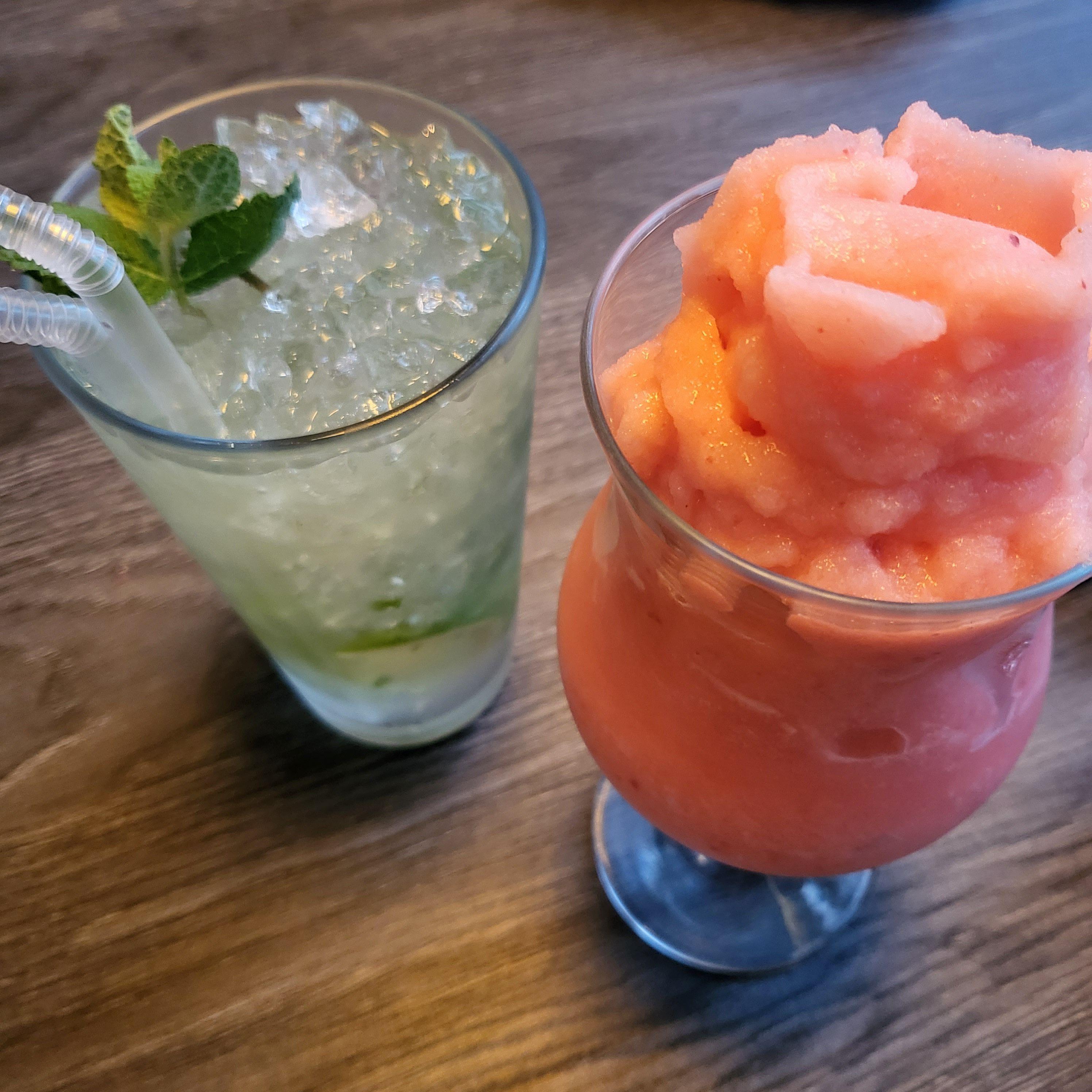 = 라임 모히또 한 잔과 알코올 없는 골드 메달리스트를 주문했다.