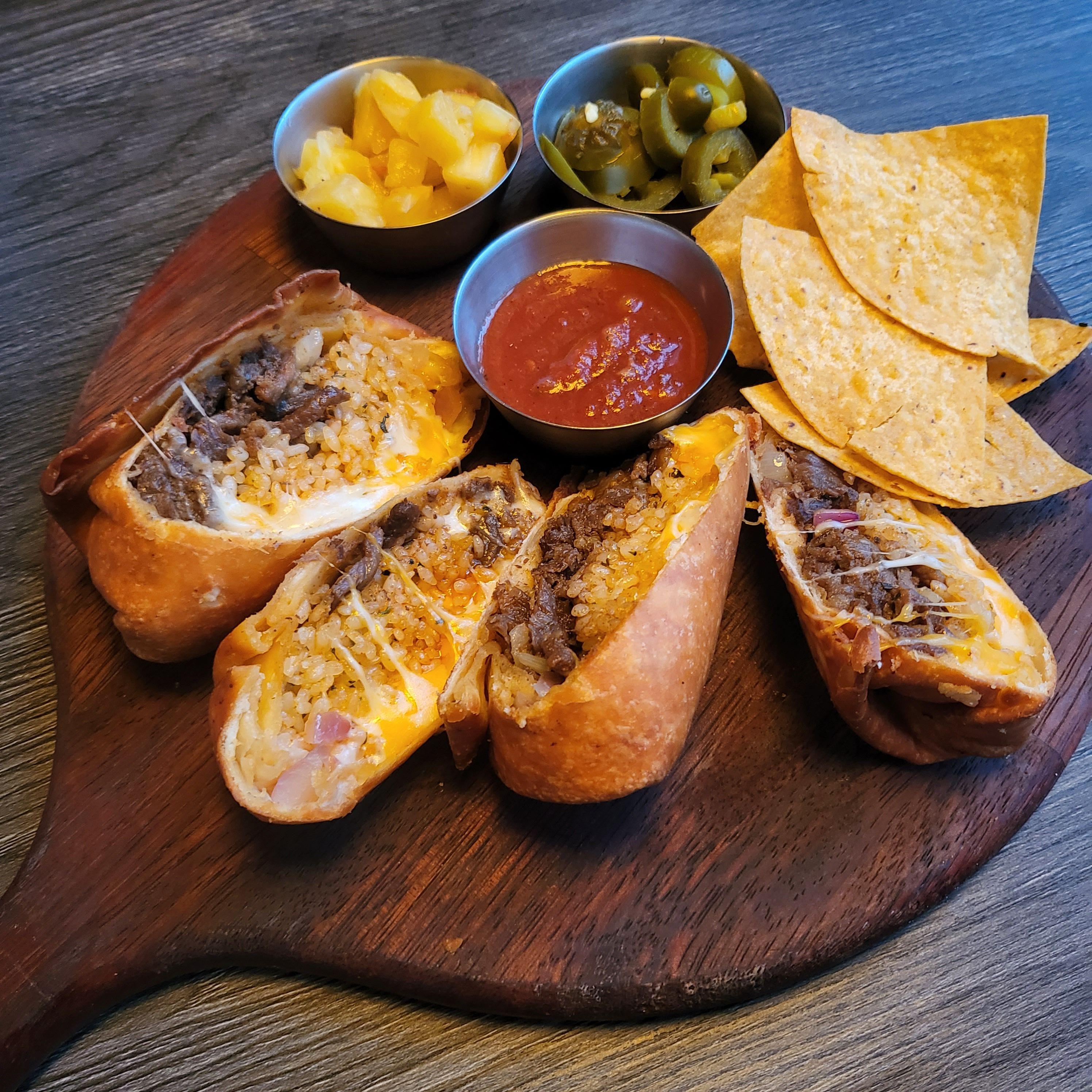 또띠아에 치즈와 밥, 고기를 넣고 튀긴 음식이에요.