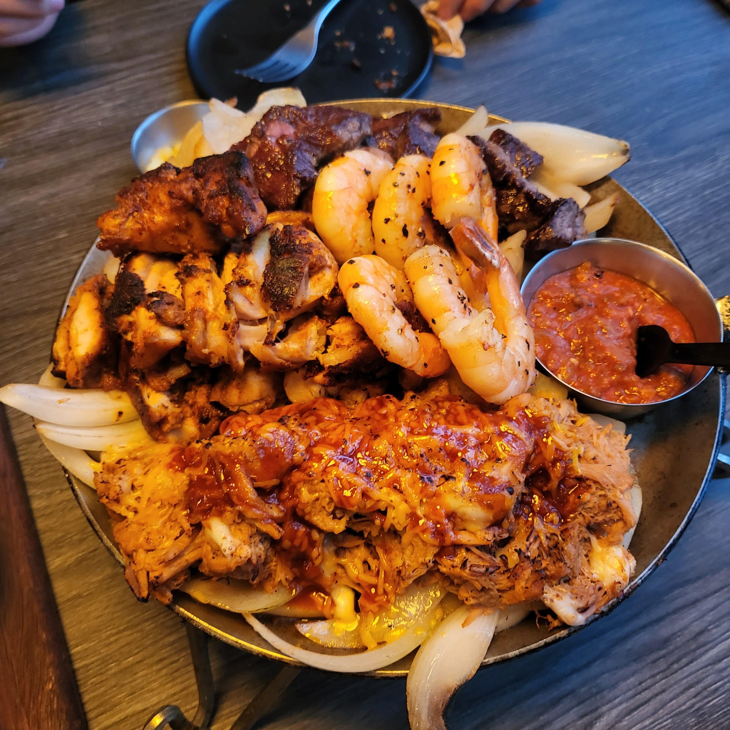 프라임 부챗살, 그릴드 치킨, 폴드 포크, 그릴드 쉬림프와 구운 양파를 또띠아에 싸 먹는 요리예요.