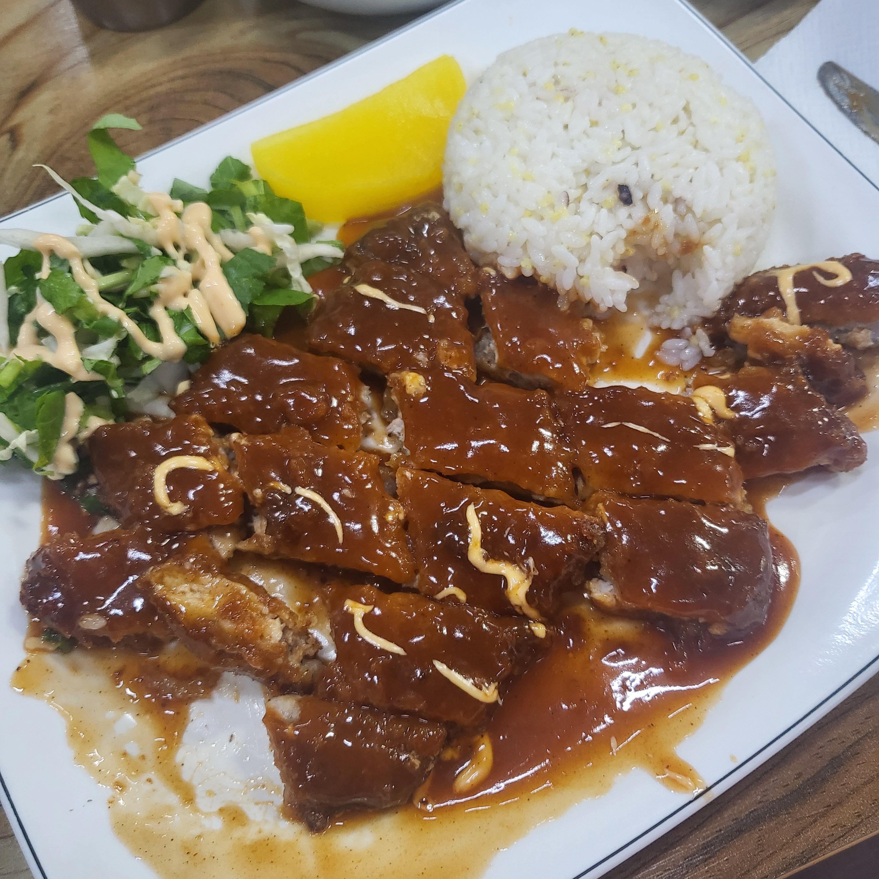 돈가스를 간혹 먹다 보면 기름기에 물리는 곳이 꼭 있거든요. 여기 돈가스는 기름지지도 않고, 두께도 정말 두툼해요. 소스도 듬뿍 올라가 있는데 정말 제가 좋아하는 돈가스 타입이에요. 저는 치즈돈가스라고 4조각 나오는 그런 돈가스 정말 별로 안 좋아하거든요ㅠㅠ