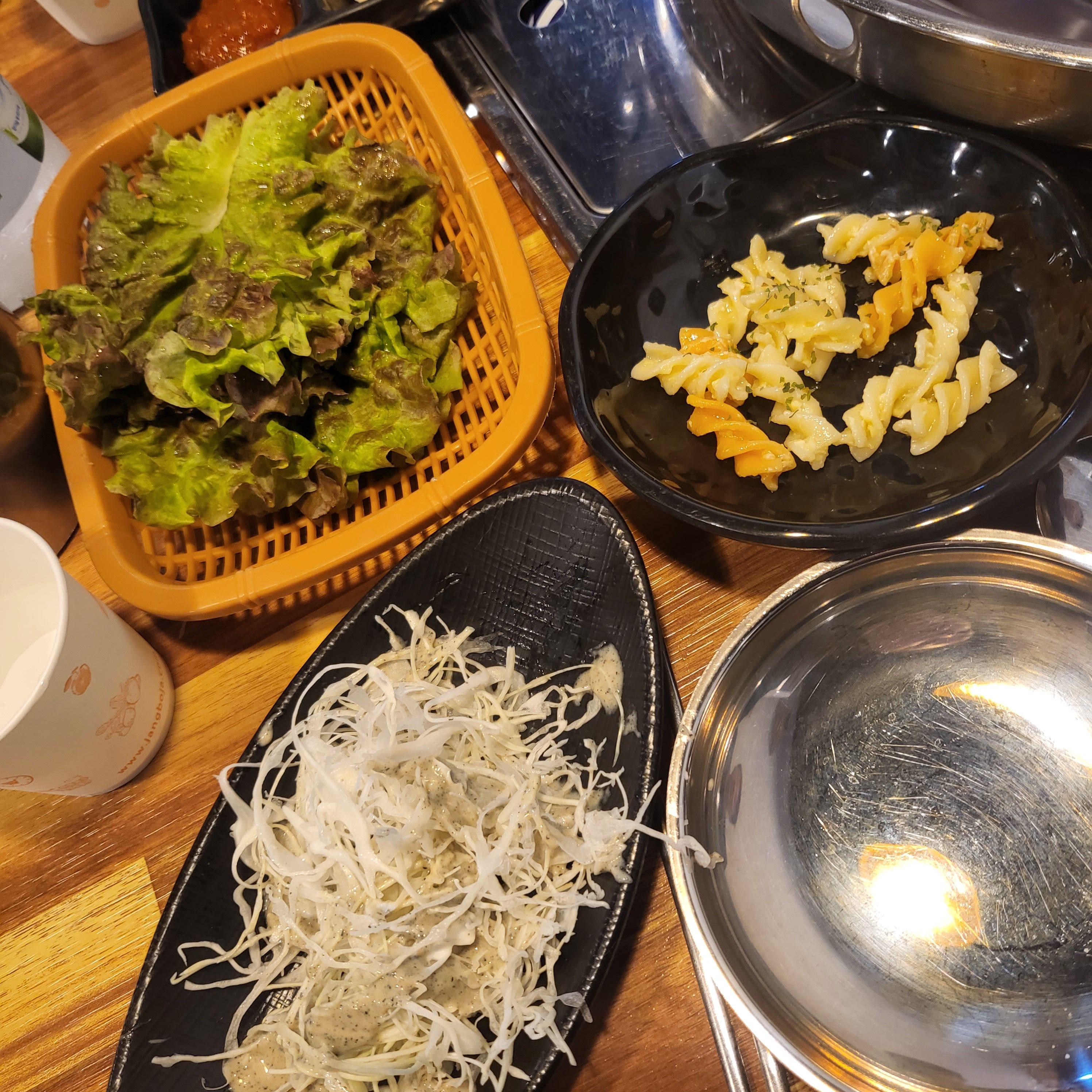 기본 반찬들로는 쌈과 샐러드 등이 나왔는데, 꽈배기처럼 생긴 파스타 면 푸질리는 너무 밀가루맛 ㅠㅠ