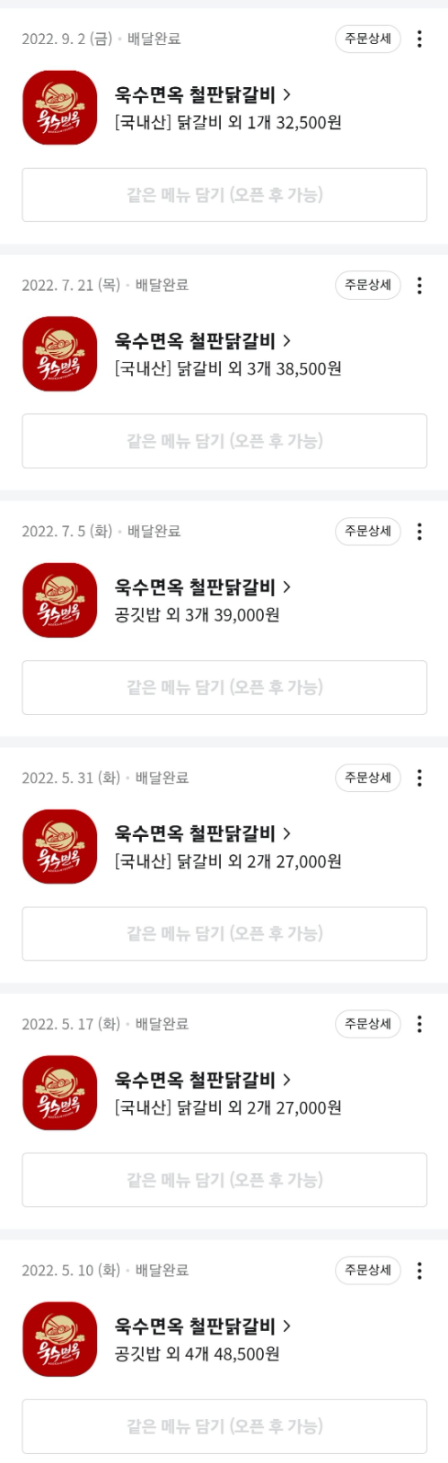 철판 닭갈비 (52,000원), 우동사리 (2,000원)