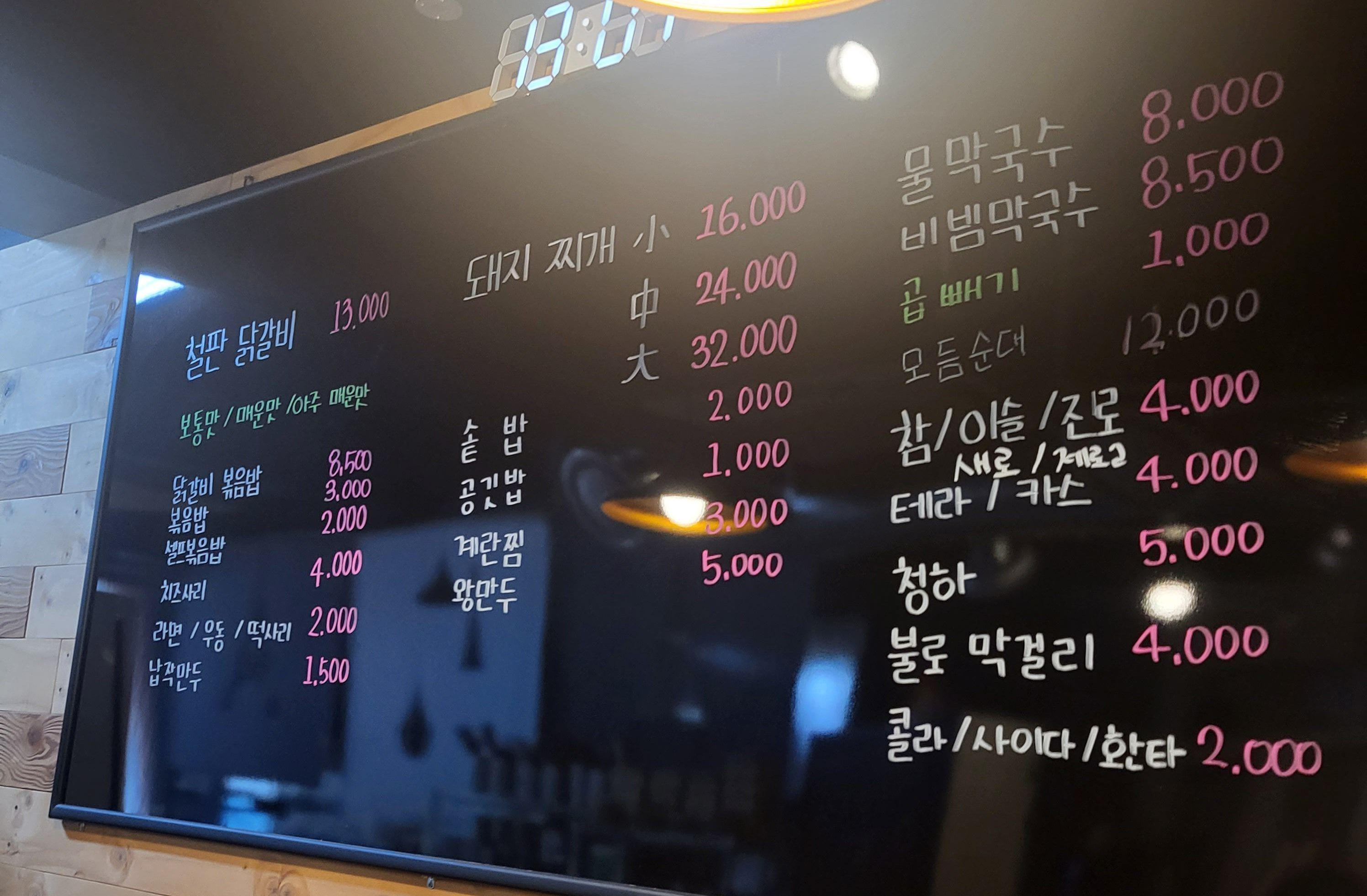 메뉴판이에요. 크게 닭갈비와 돼지찌개, 막국수가 있어요.