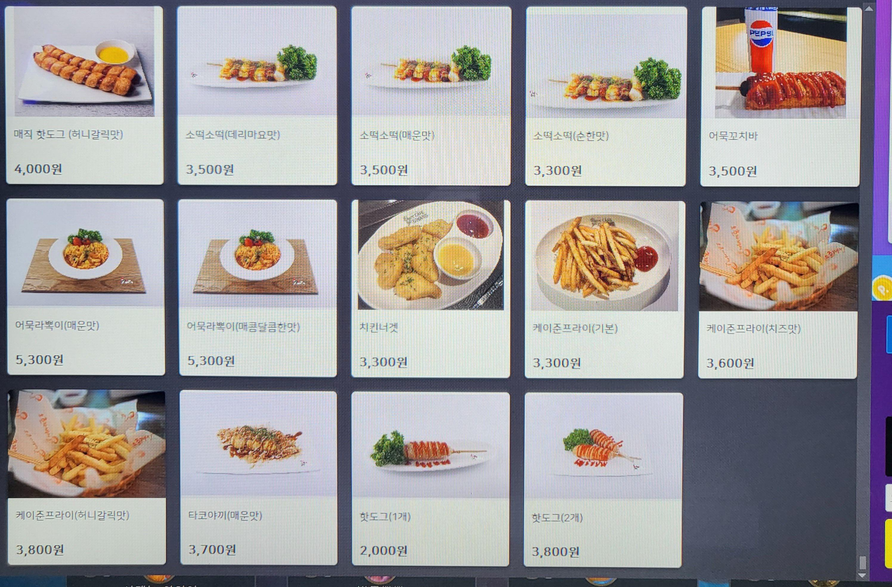 핫도그는 물론이고, 떡볶이와 치킨너겟, 감자튀김, 소떡소떡 등 간식류 종류도 되게 많이 있어요. 정말 음식 종류가 김밥천국 저리 가라 할 정도의 종류예요.