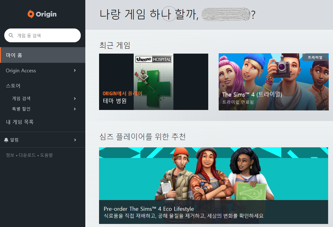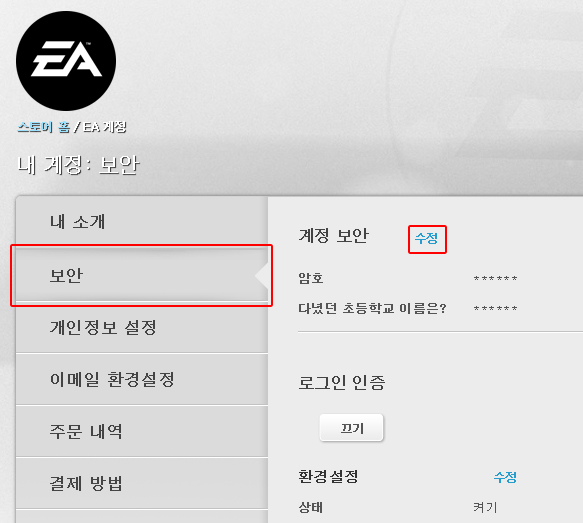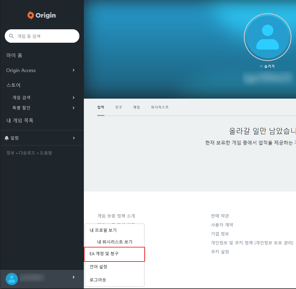 로그인하시고 왼쪽 하단 클릭하셔서 'EA 계정 및 청구' 버튼을 누릅니다. 그럼 새 창이 하나 떠요.