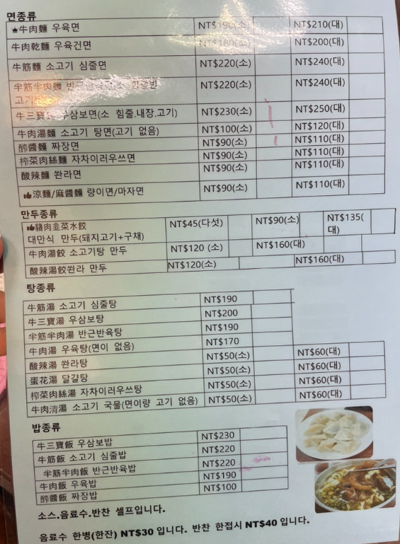 메뉴 : 우육면 대 210NTD (9,450원), 소 190NTD (8,550원), 대만식 짜장면 대 110NTD (4,950원), 소 90NTD (4,050원)