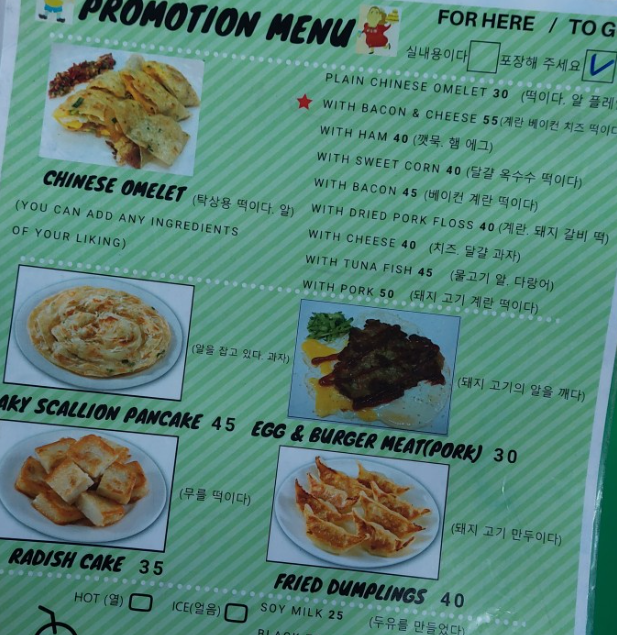 메뉴 : 딴삥(치즈오믈렛) 55NTD (2,475원), 뤄보까오(무떡, RADISH CAKE) 35NTD (1,575원) , EGG&BURGER PORK 30NTD (1,350원)