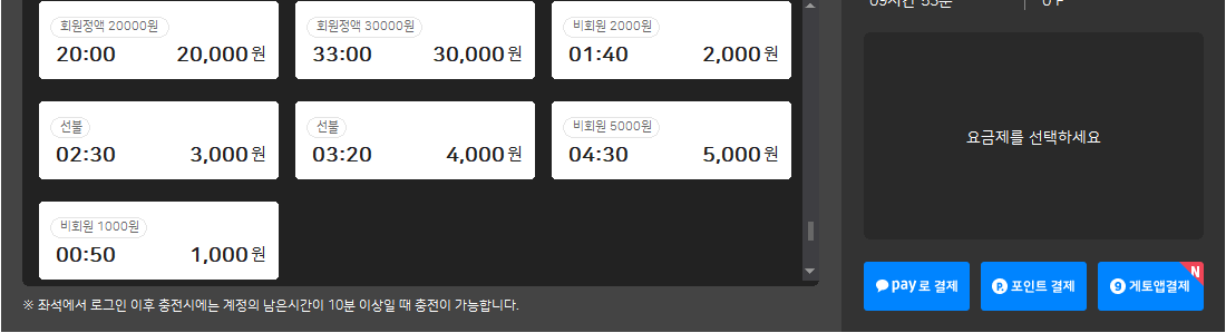 여기는 회원과 비회원의 요금 차이가 있어요. 같은 1,000원이지만 회원은 55분이고, 비회원은 50분이랍니다.