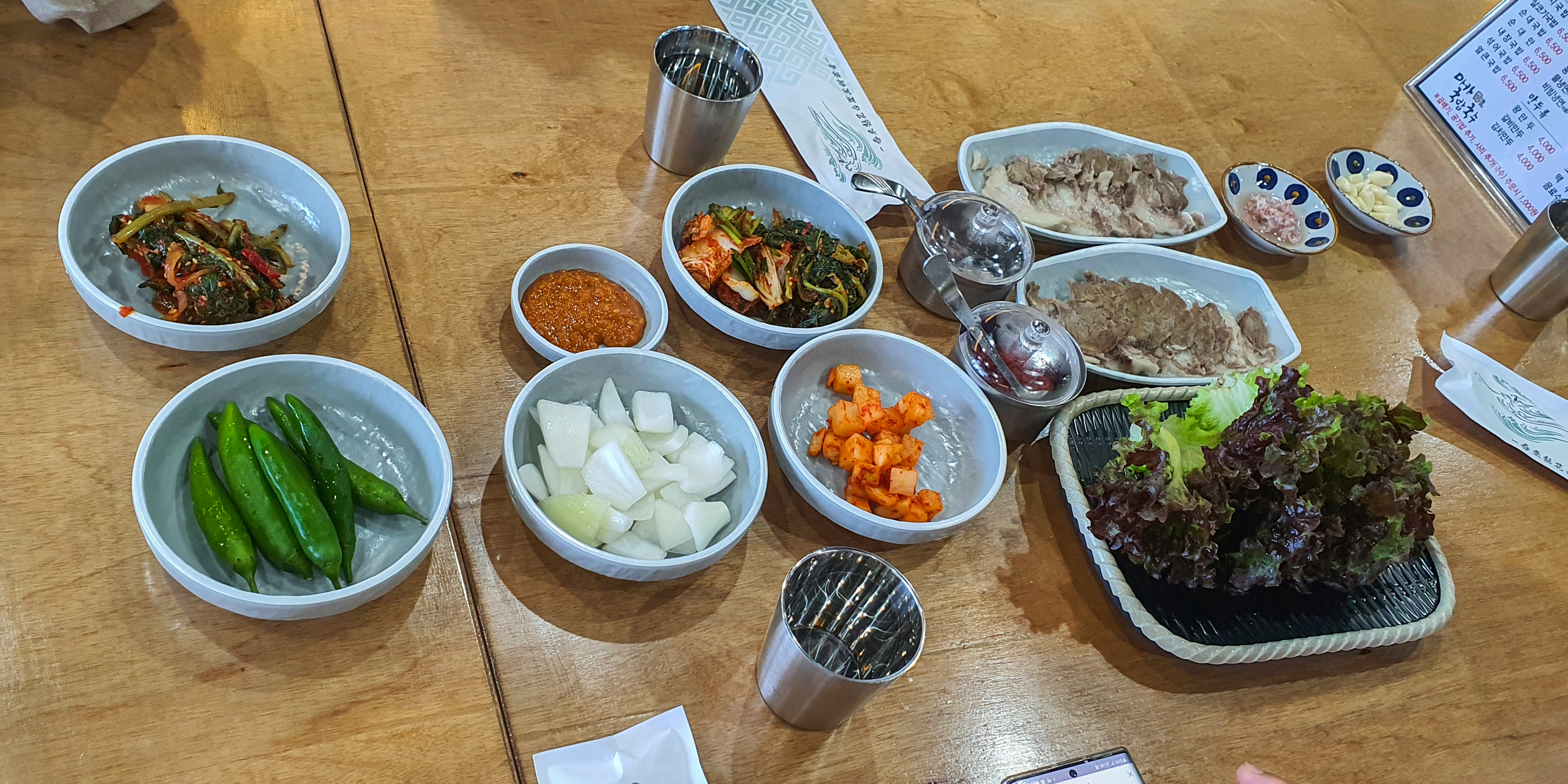 기본 반찬들이랑 수육백반이에요. 기본 반찬들은 셀프예요.
