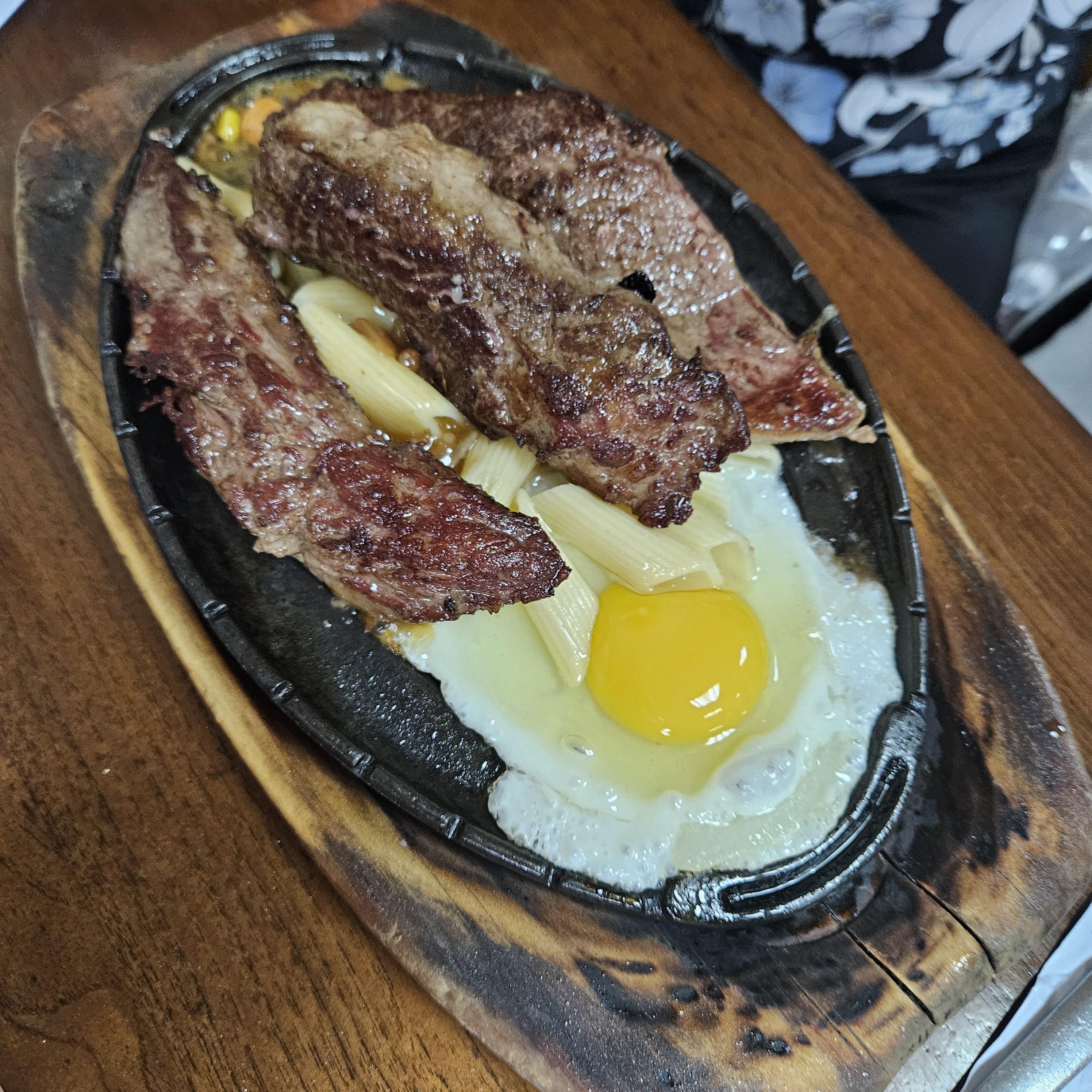 스테이크에도 계란과 파스타 종류 중 하나인 펜네가 함께 나왔어요.