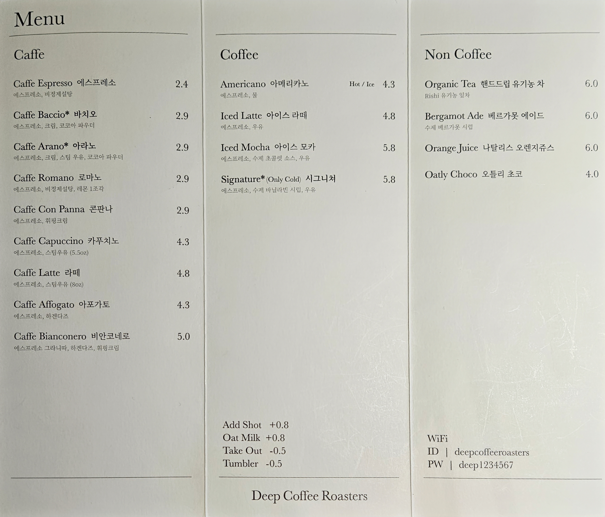 딥 커피 로스터스의 메뉴, 가격