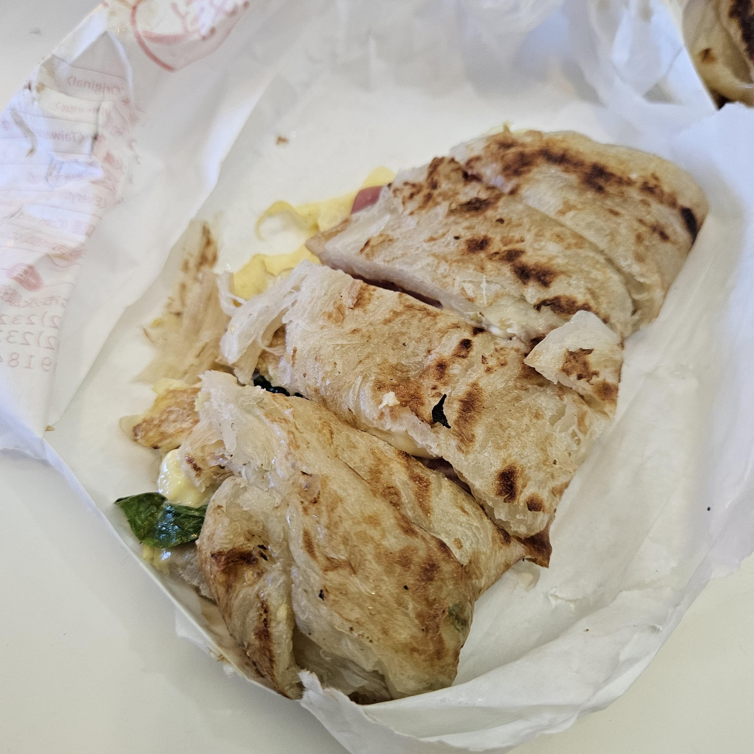 총좌빙은 동그란 반죽에 재료들을 얹고 반으로 접은 형태로, 4등분으로 컷팅도 해주셔서 먹기 편했어요.
