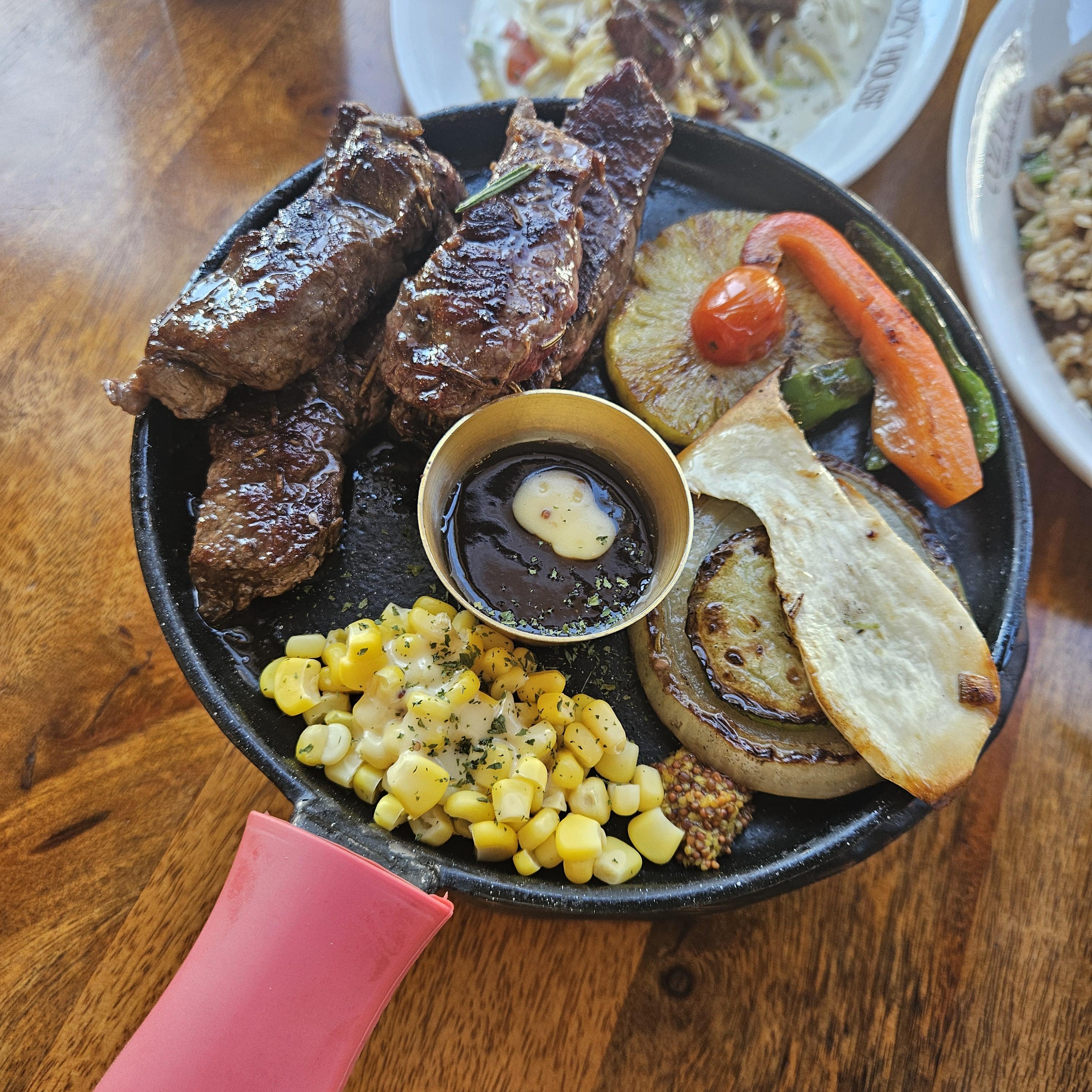 뜨거운 팬에 스테이크와 스테이크 소스, 버섯, 파인애플 등 각종 야채와 과일이 구워져 있고, 콘샐러드가 함께 나와요.