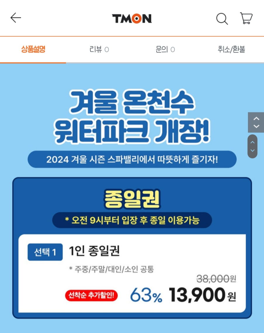 티몬에 스파밸리 1인 13,900원 특가로 떴길래 부랴부랴 결제해서 설 연휴에 다녀왔어요.