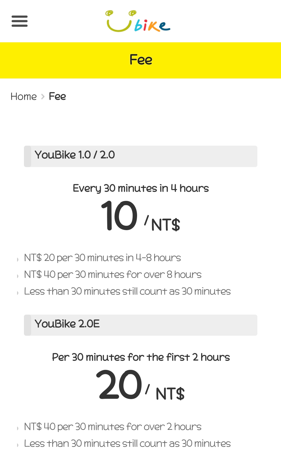 유바이크 1.0/2.0의 기본요금은 30분마다 10 TWD (약 410원)이고, 4시간 이상 이용할 경우 요금이 증가하여 4시간 이후부터는 30분마다 20 TWD (약 820원)이 부과됩니다. 30분 이내라면 10 TWD (약 410원)이에요. 유바이크 2.0E의 기본요금은 30분당 20 TWD (약 820원)으로 2시간 이후부터 30분당 40 TWD (약 1600원)이 부과돼요. 30분 미만은 20 TWD (약 820원)이에요.