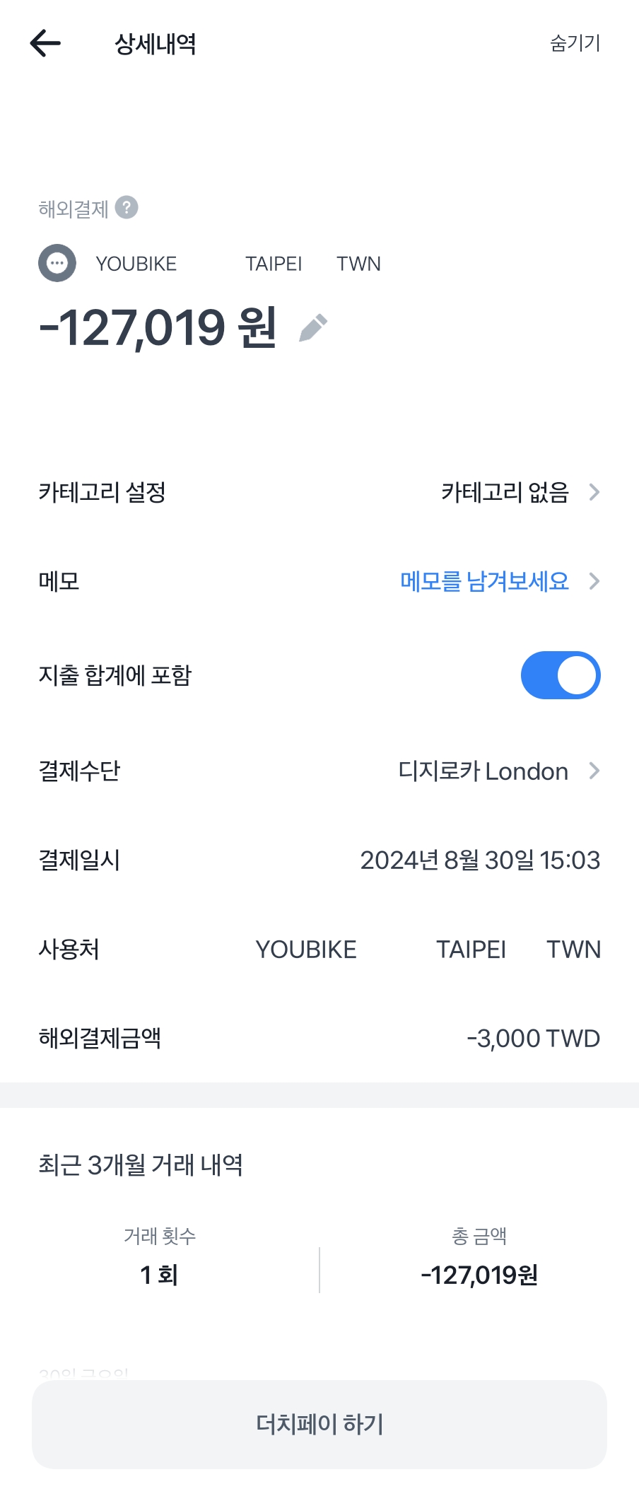 카드를 등록하면 3000 TWD인 약 13만 원이 결제가 되는데 나중에 다시 취소가 돼요.