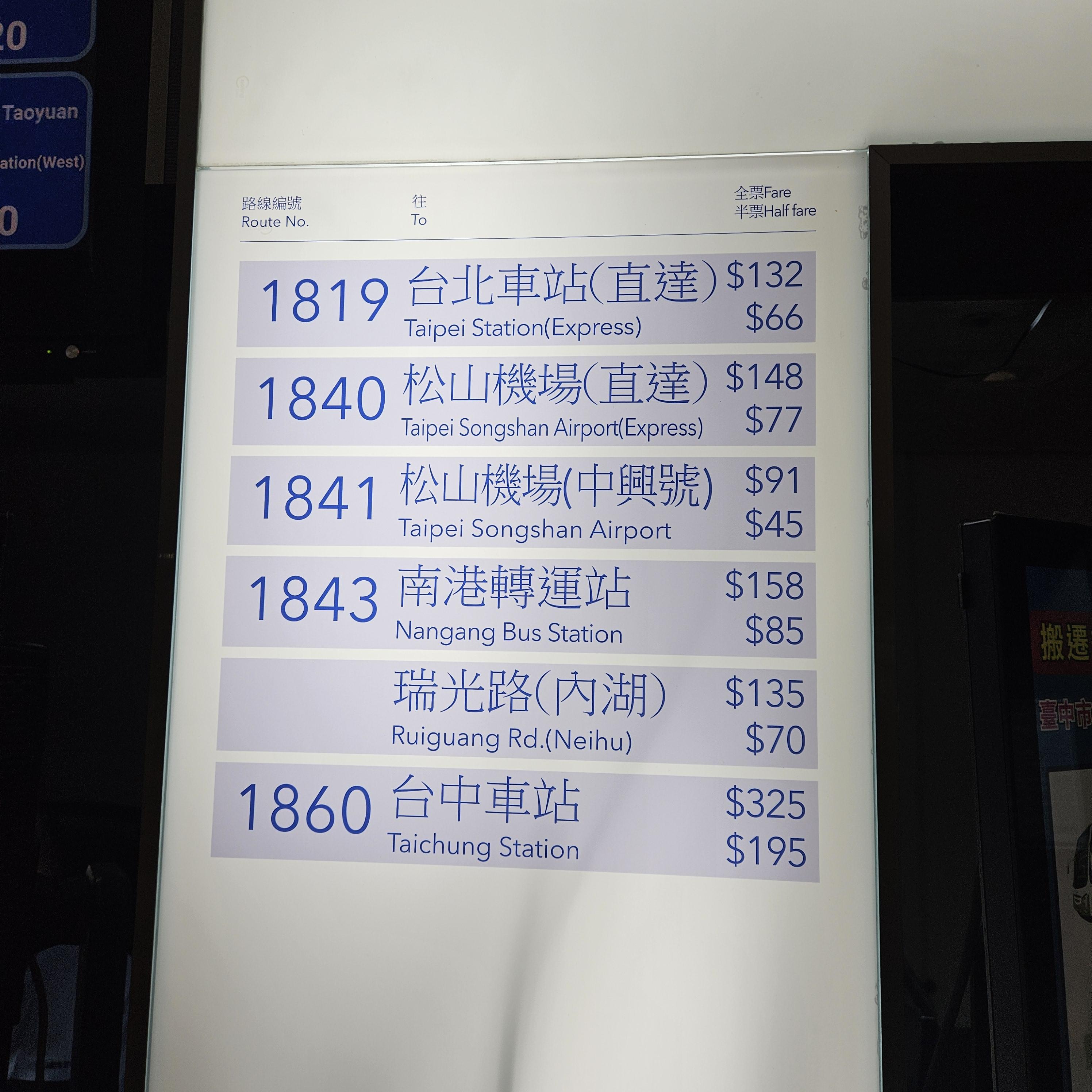 국광버스 1819 시간표 (타이베이역 출발 → 타오위안 공항 도착)