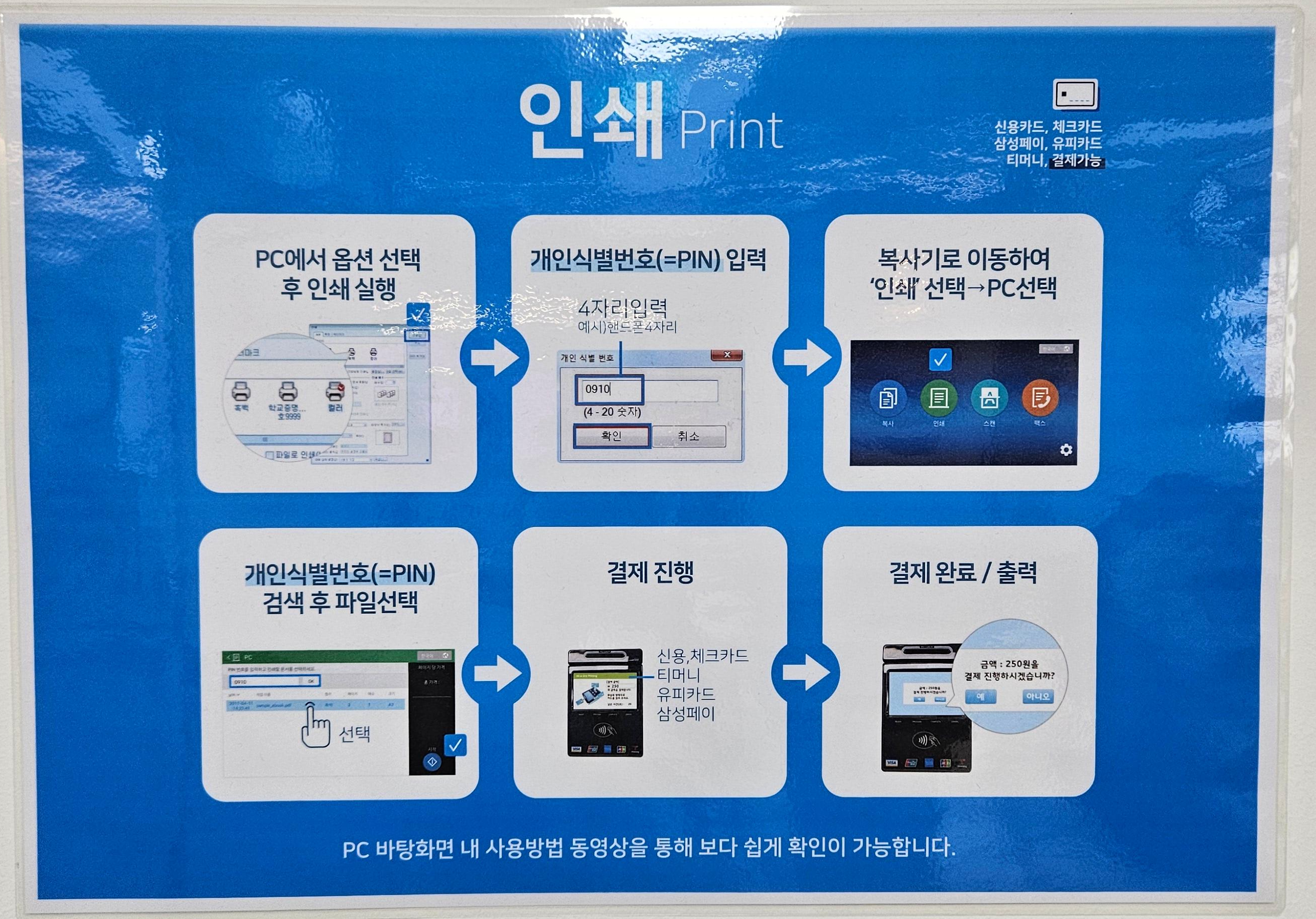 결제 방법은 다양하게 있어요. 카드 결제가 가능하고, 애플페이, 삼성페이도 가능해요. 티머니 카드도 가능하고, 충전 후 결제할 수 있는 유피카드도 있어요. 유피카드는 프린트카페에서 바로 충전하여 사용할 수 있어요.