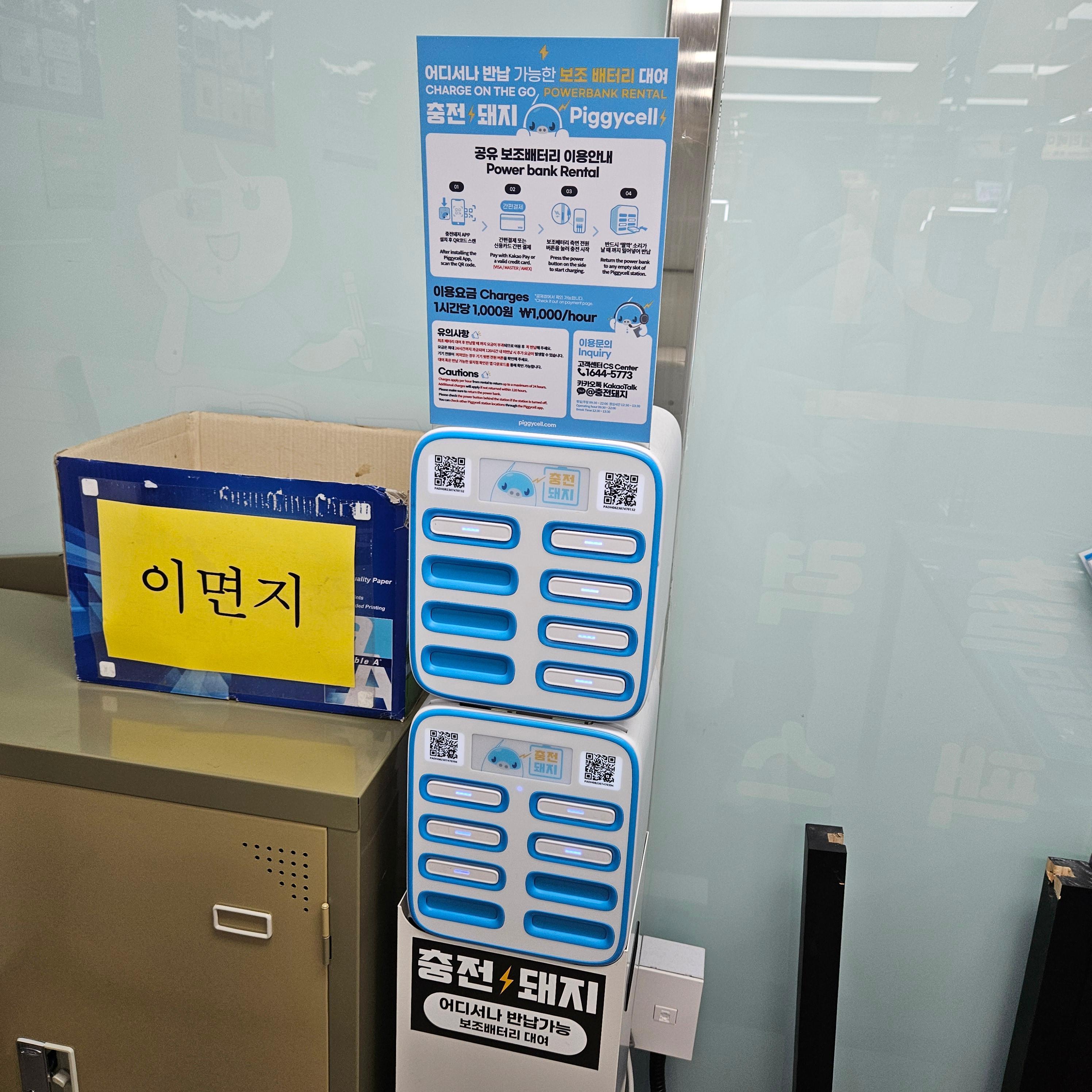 프린트 카페에는 보조배터리도 대여하고 있어요. 충전 돼지 Piggycell의 공유 보조배터리로, 대여 후 어디서나 반납이 가능해 반월당역으로 다시 가져오지 않아도 되는 장점이 있어요.