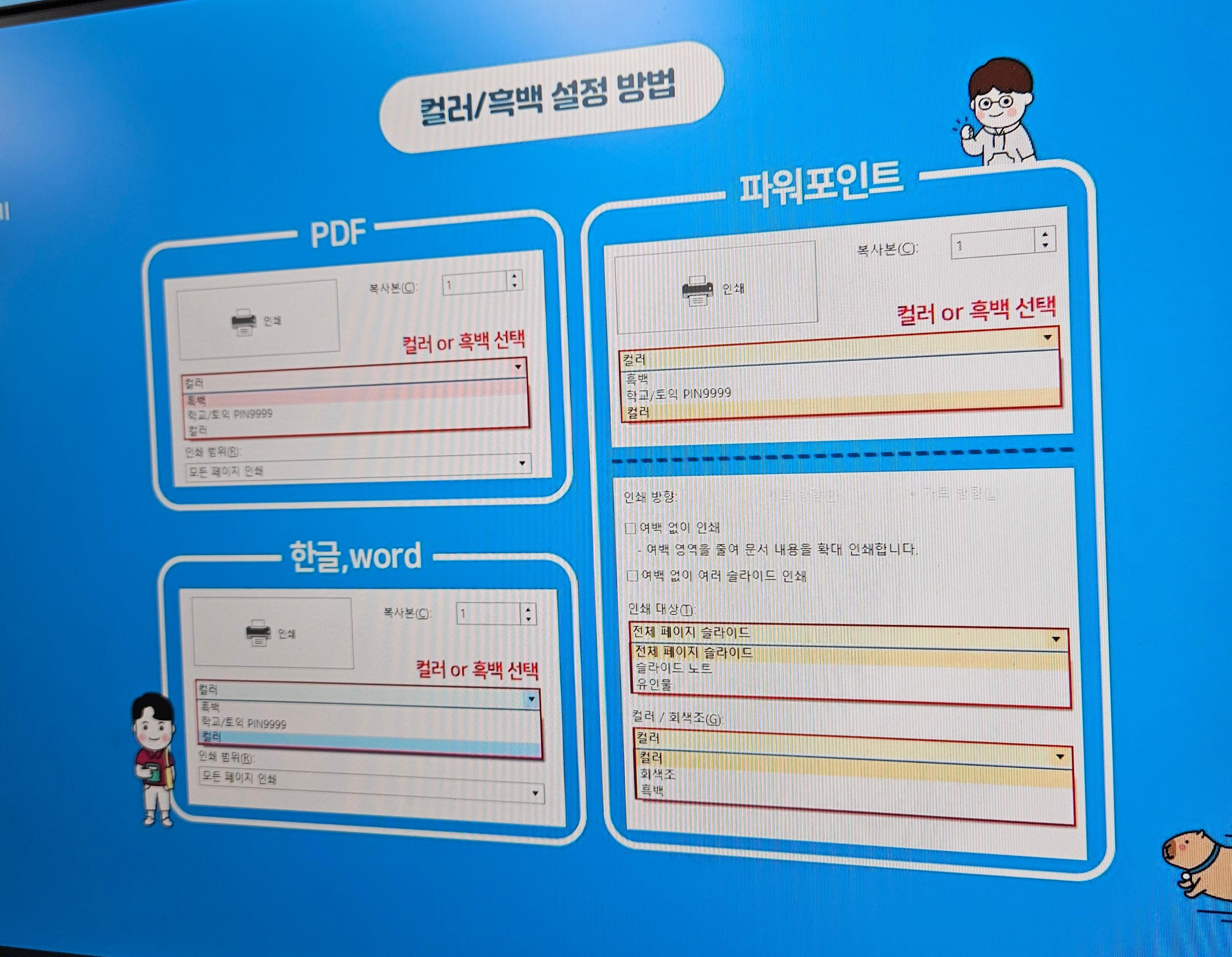 컬러와 흑백 설정 방법도 자세하게 나와있어요. 이것도 잘 숙지하셔서 컬러를 뽑아야 하는데 흑백을 뽑는다거나, 흑백을 뽑아야 하는데 컬러를 뽑는 실수를 하지 않게 조심하시길 바라요.
