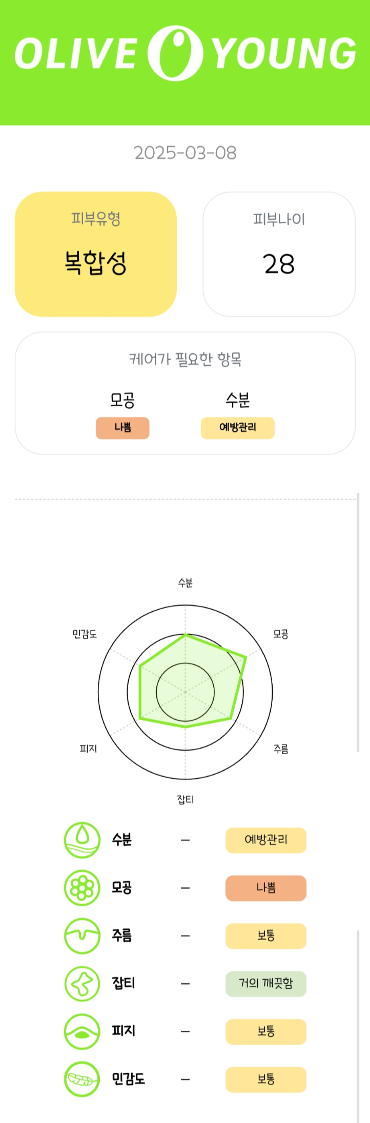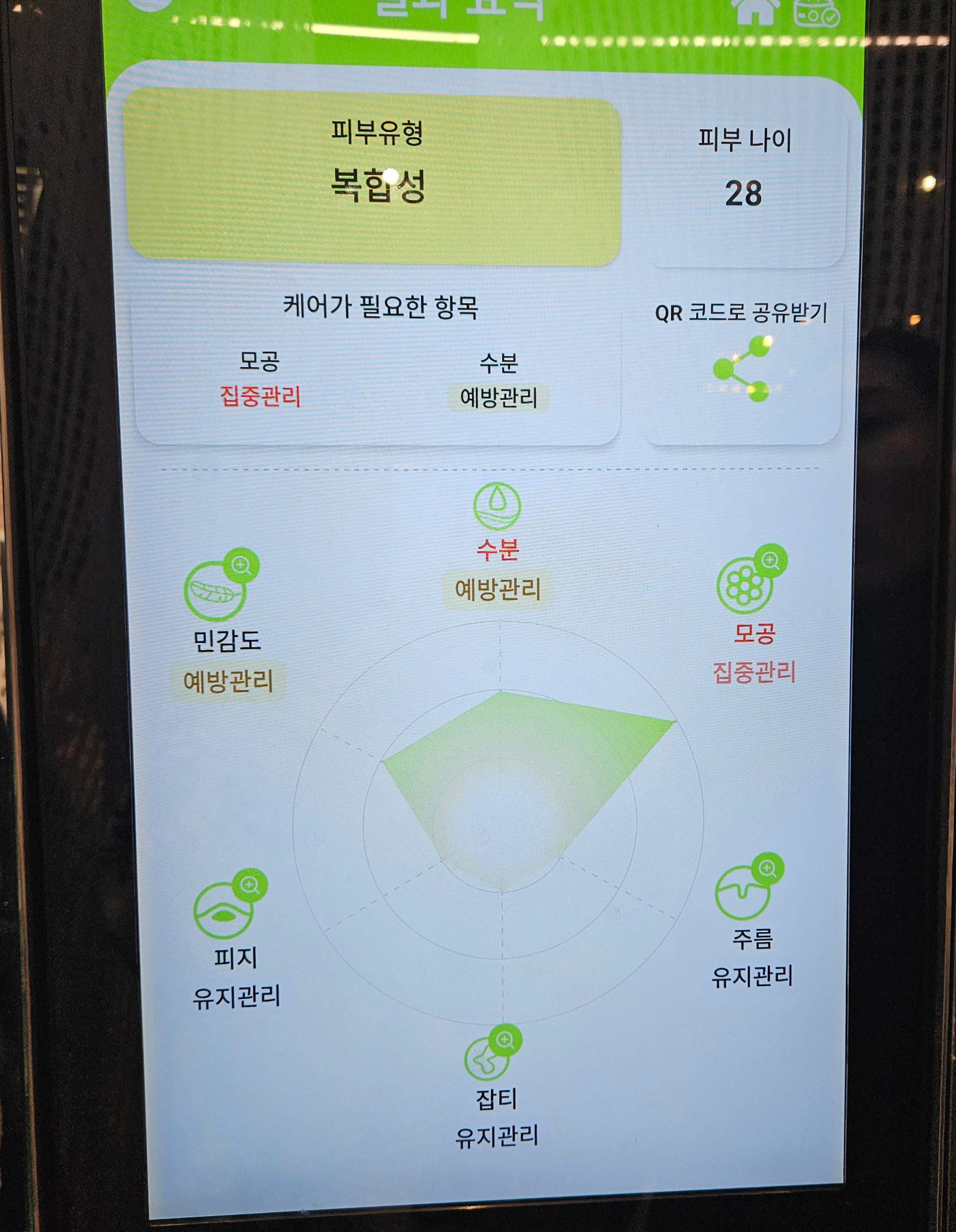 피부유형과 수분, 모공, 주름, 잡티, 피지, 민감도에 관한 정보가 나오고, 관리가 필요한 항목들도 나와요.