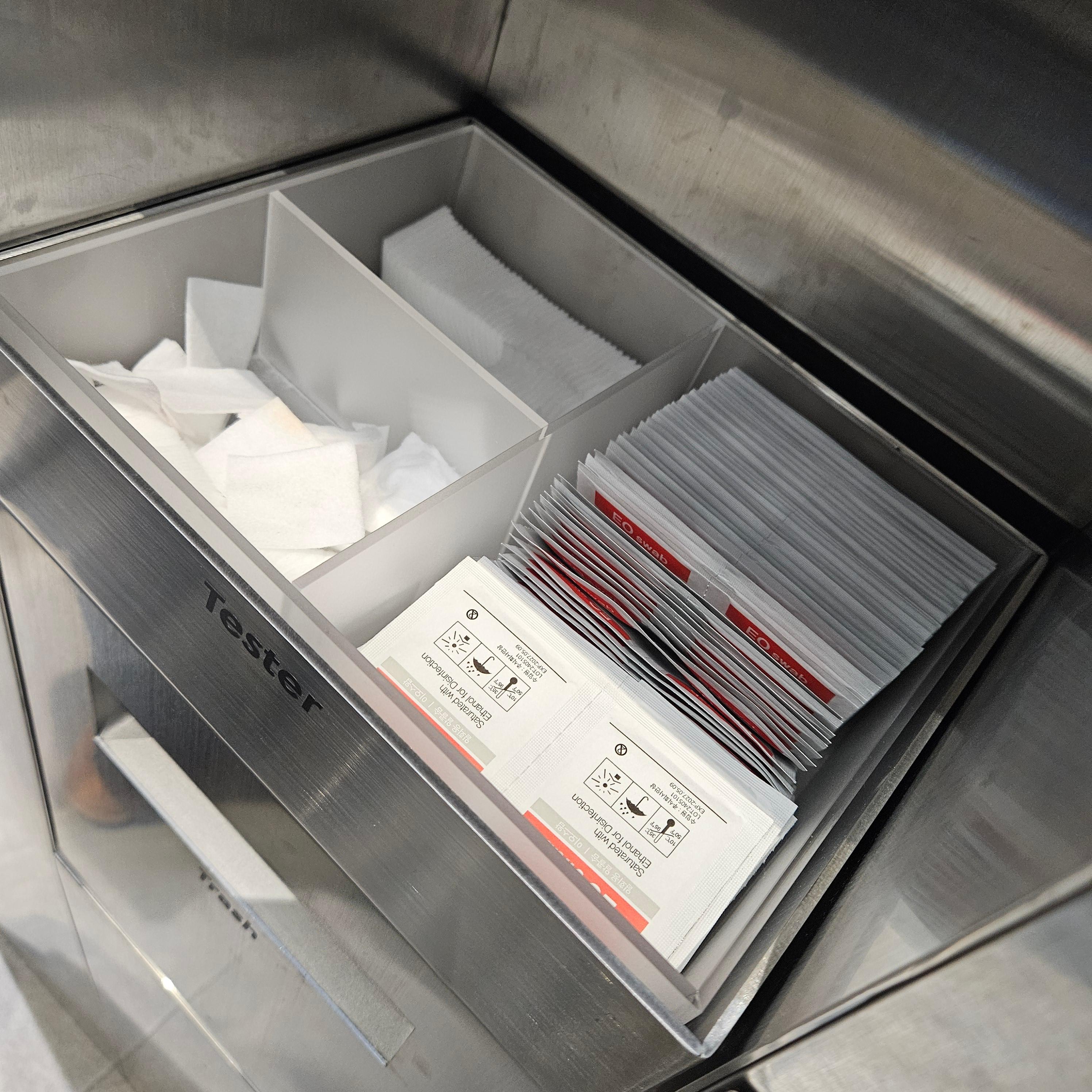 피부 진단 방식은 카메라를 직접 피부에 갖다 대는 방식이에요. 그래서 카메라 렌즈 부분을 닦을 수 있게 일회용 알코올솜도 비치되어 있어요. 먼저 들어가자마자 카메라 렌즈부터 닦아줬어요.
