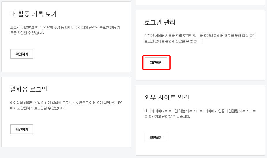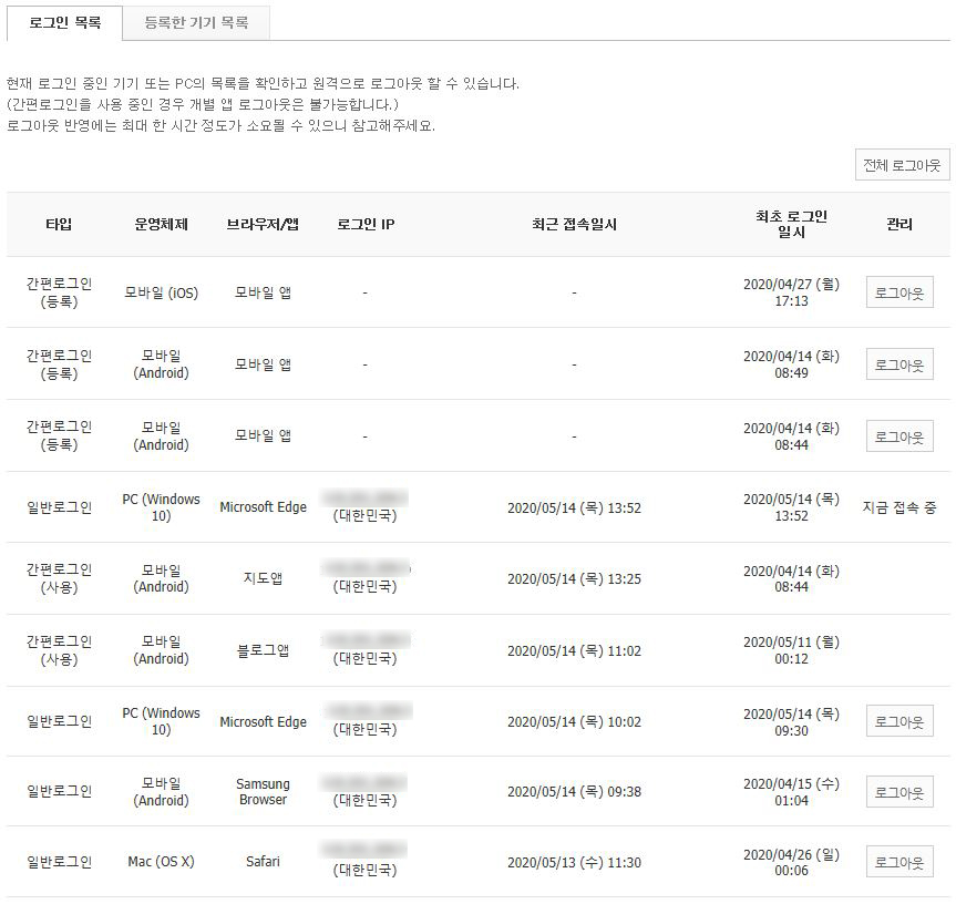 로그인 관리 탭에서는 내 아이디가 로그인되어 있는 기기들을 볼 수 있습니다.