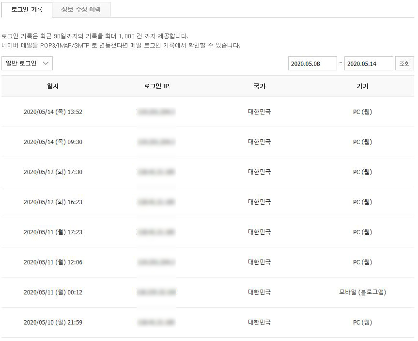 로그인했던 날짜와 시간, 로그인했던 기기의 IP주소, 국가와 해당 기기의 간단한 정보를 볼 수 있습니다.