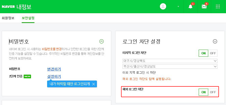 보안설정에 들어가면 바로 '해외 로그인 차단' 버튼이 보입니다.