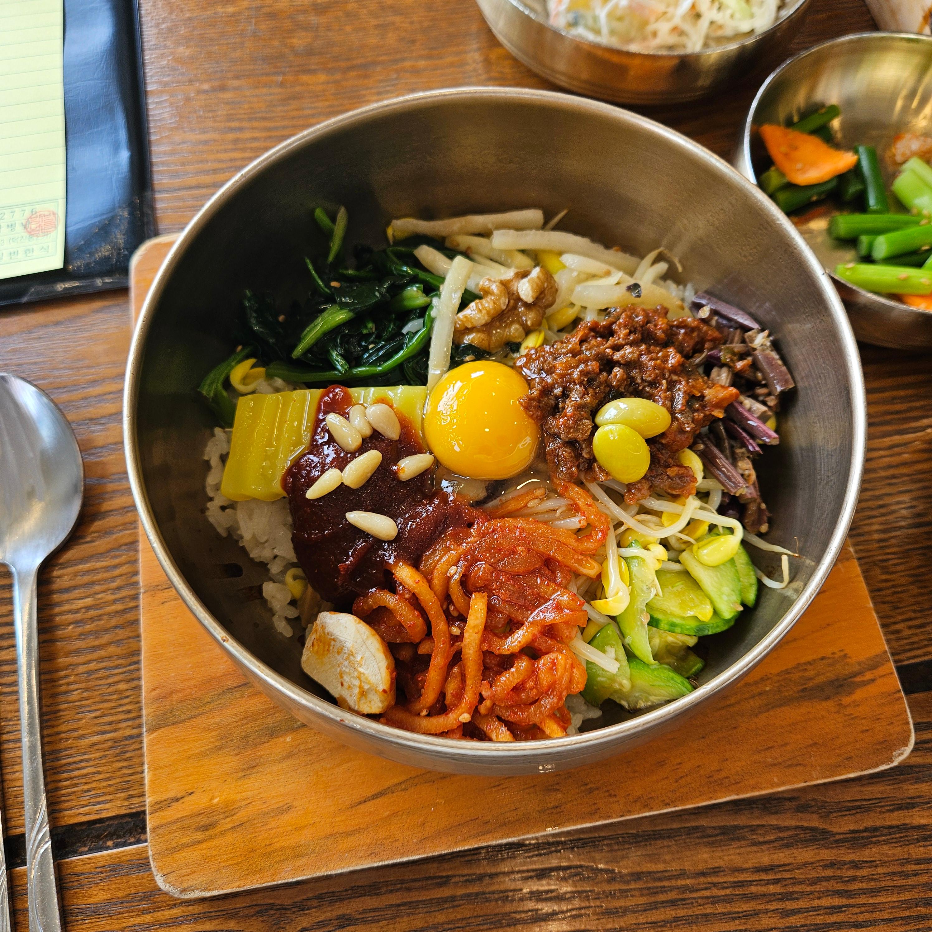 황포묵, 은행, 호두, 시금치, 콩나물, 김가루, 애호박, 계란, 잣 등.. 비빔밥 안에 재료가 되게 다양하더라고요.
