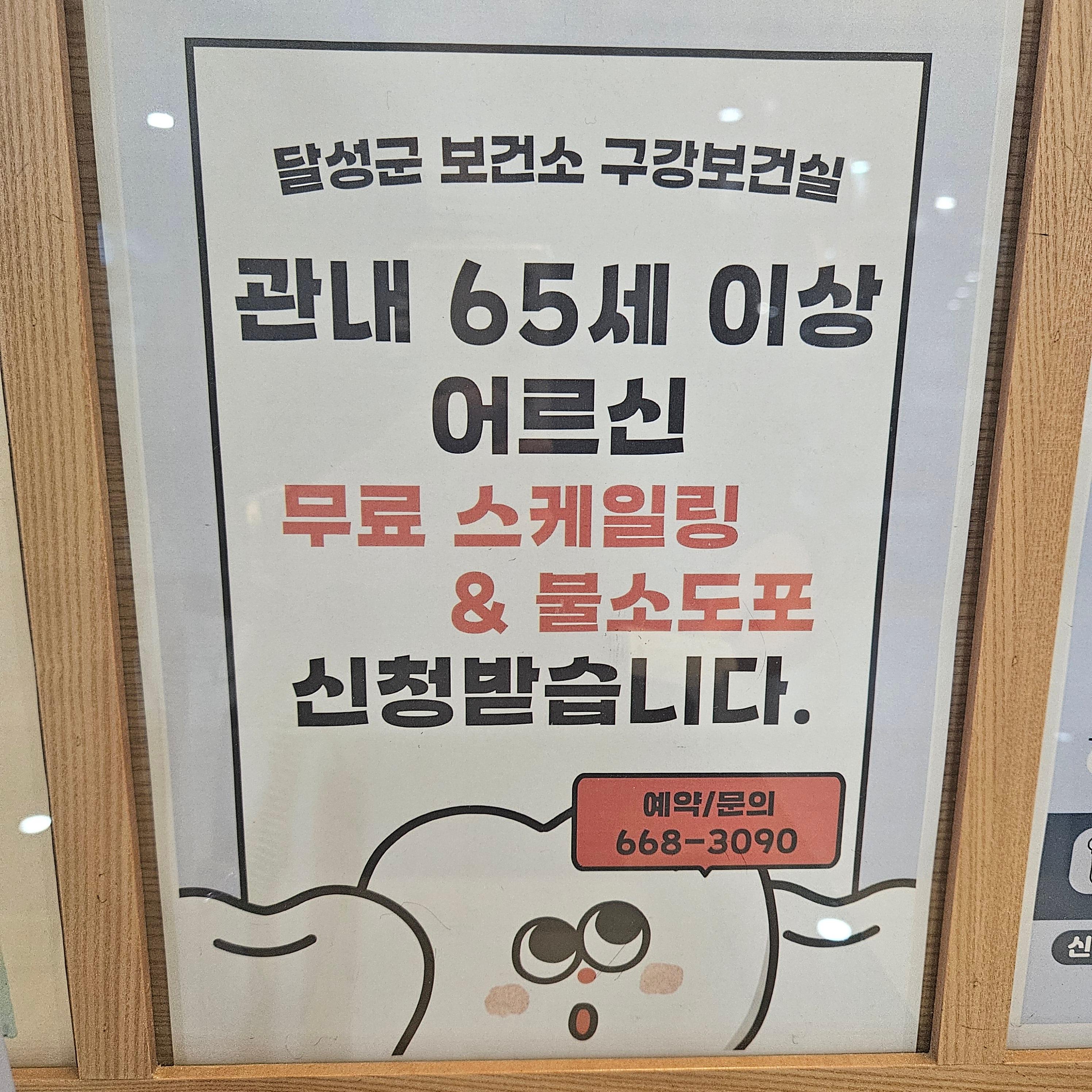 달성군 보건소 구강보건실에서 달성군 65세 이상 어르신들을 대상으로 무료로 스케일링과 불소도포 서비스를 제공하고 있다고 합니다.